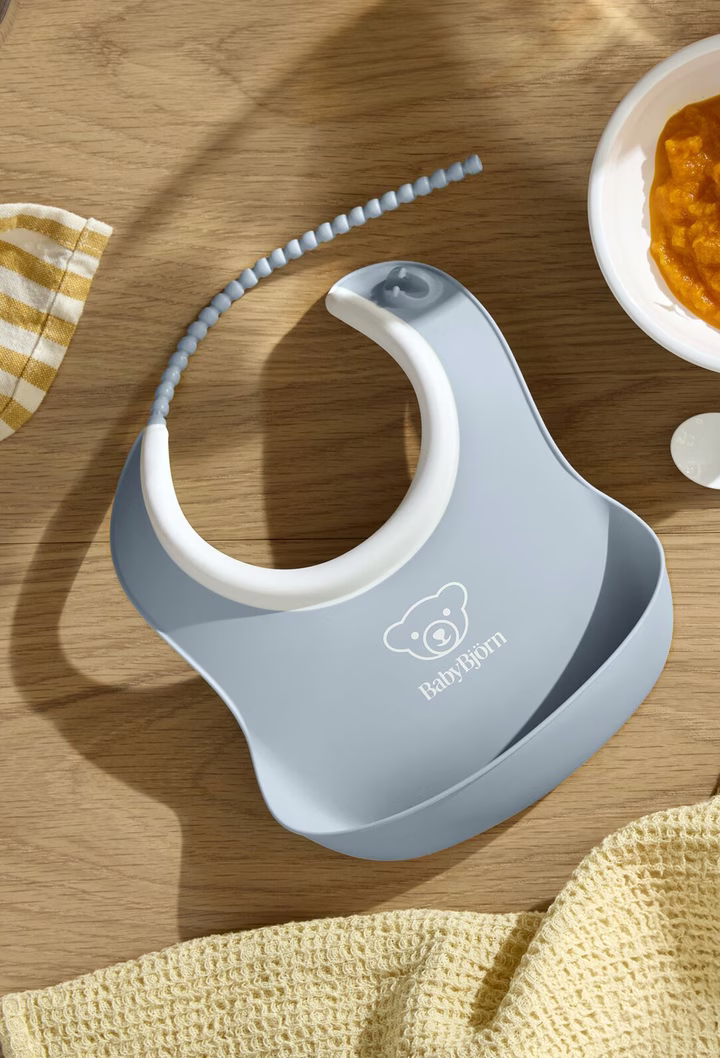 El Mini Babero (Pack 2 uds) BabyBjörn está fabricado en plástico suave y flexible (PP y TPE), materiales seguros para el contacto con alimentos, libres de BPA y PVC. Es ligero, resistente y muy fácil de limpiar, perfecto para el uso diario durante las primeras comidas del bebé