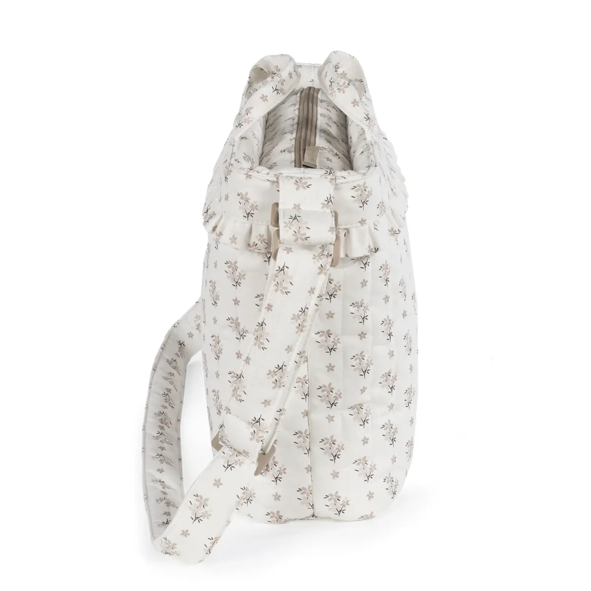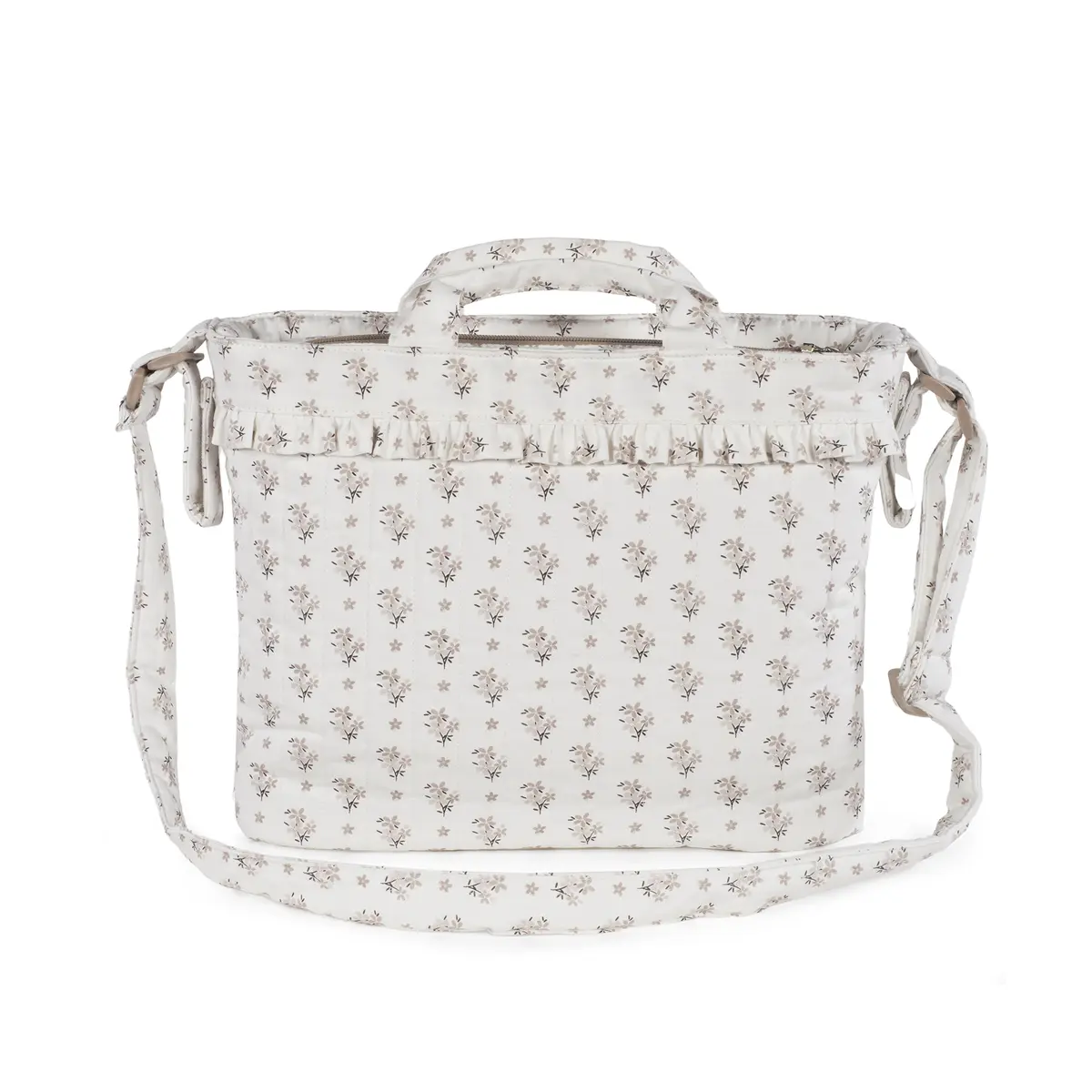 Bolso cambiador Botton con estampado floral para silla de paseo que incluye cambiador para bebe. Bolsa canastilla muy ligera, resistente y de gran capacidad para llevar todo lo necesario para el paseo del bebe. Tiene multiples bolsillos para poder tener todo ordenado. En el interior incopora un bolsillo plastificado para la ropa húmeda, un bolsillo térmico para biberones y dos bolsillos para lo que necesites tener más a mano. La bolsa tiene un sistema universal de fijación, con 2 asas cortas ajustables que facilita la colocación en cualquier modelo de silla de paseo. También incorpora una asa larga para poder colgarla en el hombro y asas cortas para cogerla con la mano. Gran calidad y mucho estilo. Fabricada en algodón 100% con un tratamiento waterproof, de fácil limpieza a mano o a máquina a 30 °C. Walking Mum protege a tu bebé utilizando los mejores tejidos, libres de colorantes azoicos y sustancias nocivas para la salud. Nuestra colección Walking Mum está diseñada con un particular sello de estilo urbano y moderno que no pasa desapercibido, para vestir diferente los paseos con tu bebé. Las bolsas de maternidad de esta línea son más sport y prácticas, especialmente pensadas en mamás y papás modernos que aprecian los diseños más actuales y en tendencia sin dejar de lado la calidad y la funcionalidad de los accesorios que complementan y hacen más cómodos todos los paseos con sus bebés. Especificaciones: Materiales: 100% algodón con tratamiento waterpfoof. Medidas: 44x29x12 cm.