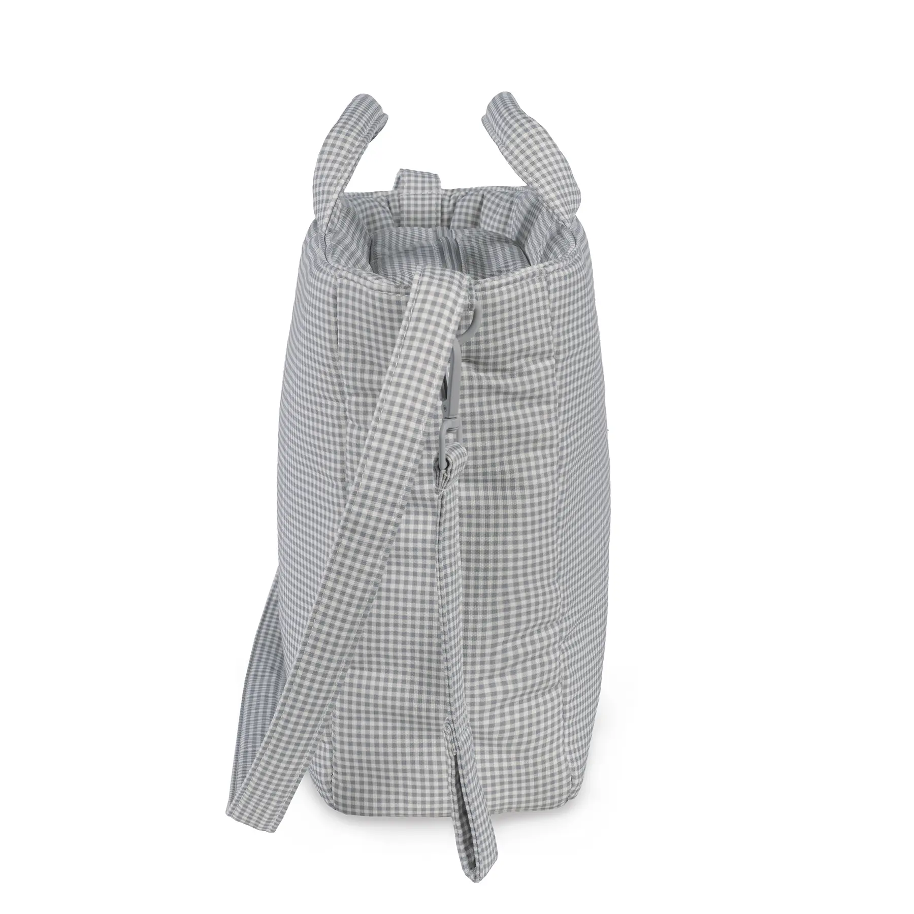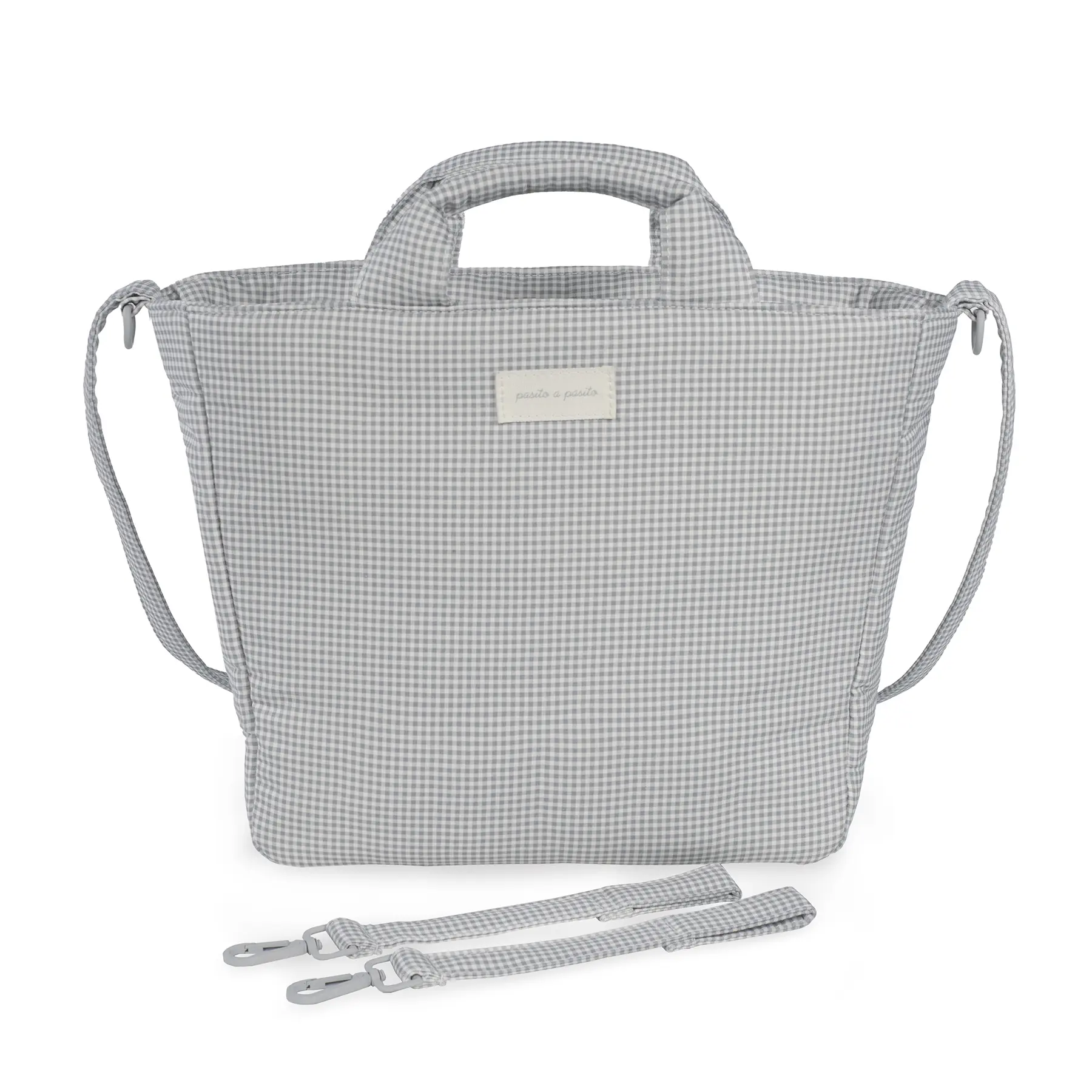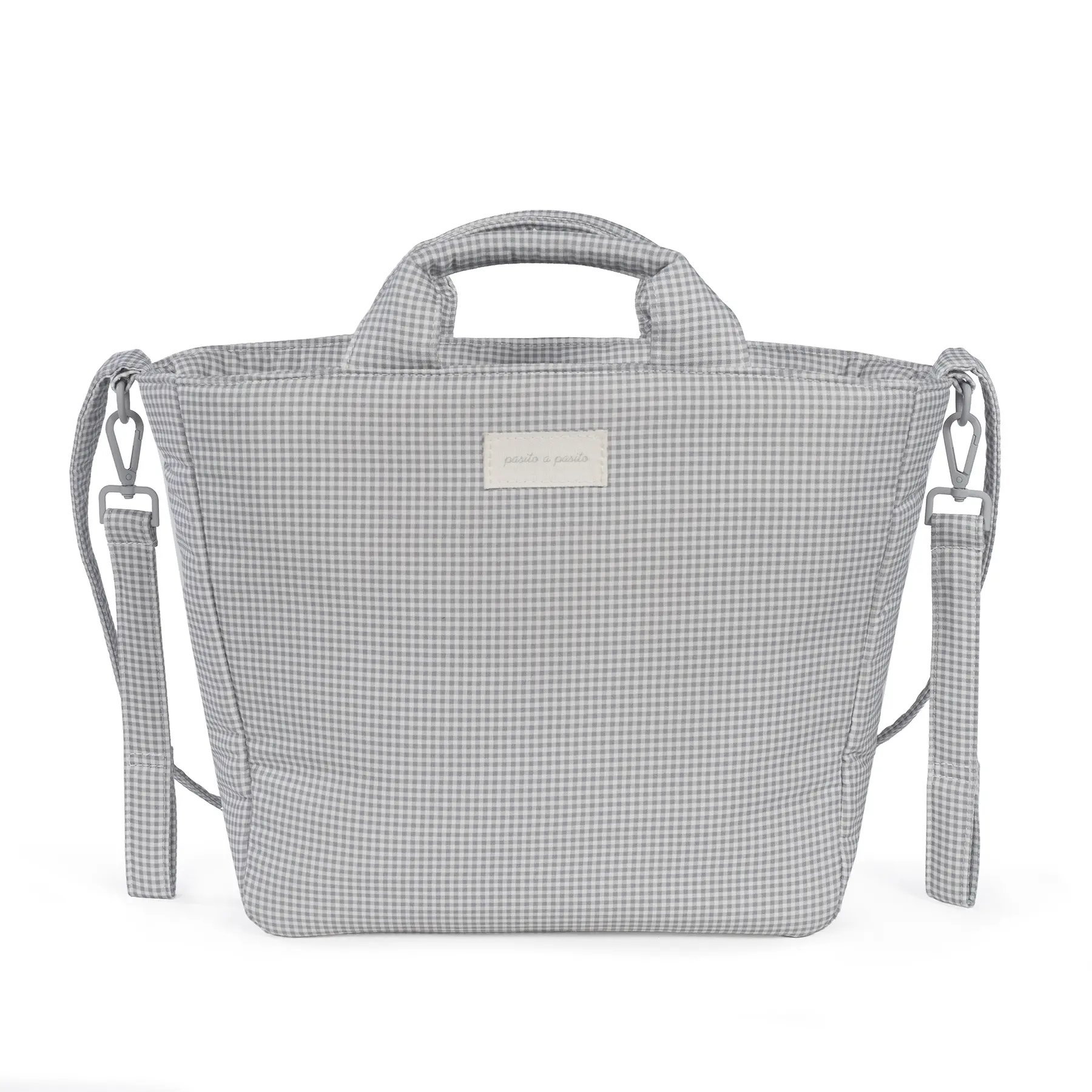 La bolsa para carrito de bebé o el bolso para silla de paseo Little Bloom Vichy gris de Pasito a pasito es un modelo único, elaborado en loneta de algodón 100% con un delicado estampado de cuadros. Su tratamiento water resistant la hace resistente al agua, garantizando protección y durabilidad en el día a día. Es un diseño muy elegante y práctico que ofrece gran capacidad para que puedas llevar de todo. Viene acondicionado con doble asa, una larga para colgar en el hombro y unas cortas de mano. Incluye asas adicionales universales para colgarla al cochecito. Además, puedes usarla para guardar tus cosas y así evitas llevar dos bolsas al mismo tiempo. Si estás en la dulce espera puedes tenerla preparada como bolsa del bebé para el hospital. Acabados de calidad. La bolsa canastilla de bebé cuenta con un forro interior y bolsillos para colocar de forma organizada el biberón, cubiertos, toallitas, pañales, cremas y cualquier otra cosa que necesite tu hijo. Entre los bolsillos hay un bolsillo térmico para biberones y un bolsillo plastificado para la ropa mojada. Incluye cambiador. Está fabricado con materiales de gran calidad, libres de colorantes azoicos, ftalatos y sustancias nocivas para la salud. Además, se puede lavar a mano o a máquina a temperaturas de hasta 30º. Los productos para bebé de Pasito a Pasito cuentan con un diseño muy diferente a todas las demás. Sus colecciones se caracterizan por el trabajo al detallada, pensadas siempre desde un punto de vista práctico. Utilizan materiales de primera calidad para remarcar la elegancia y la armonía en cada una de sus piezas. Nuestros modelos son exclusivos y de estilo inconfundible, pensados para madres actuales que gozan de buen gusto y que aprecian los detalles tanto como nosotros. Especificaciones: Materiales: 100% algodón. Medidas: 37X30X12 cm.