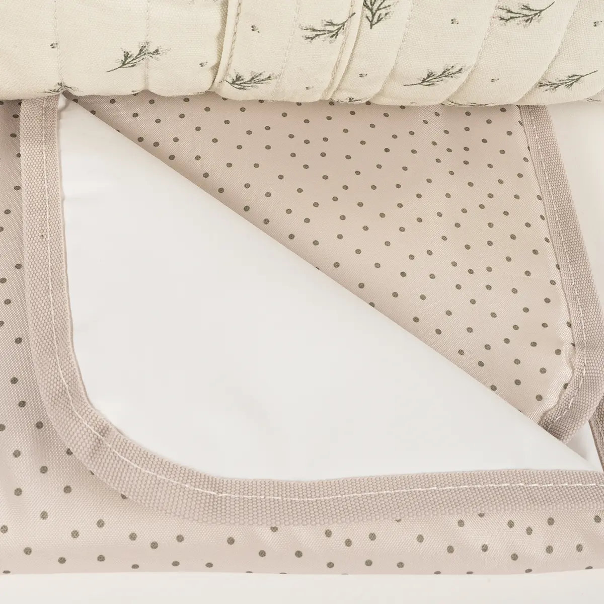 Bolso cambiador Mimosa Verde con estampado floral para silla de paseo que incluye cambiador para bebe. Bolsa canastilla muy ligera, resistente y de gran capacidad para llevar todo lo necesario para el paseo del bebe. Tiene multiples bolsillos para poder tener todo ordenado. Dispone en el exterior de dos bolsillos laterales para botellas o biberones y un bolsillo con cremallera frontal. En el interior incopora un bolsillo plastificado para la ropa húmeda, un bolsillo térmico para biberones y dos bolsillos para lo que necesites tener más a mano. La bolsa tiene un sistema universal de fijación, con 2 asas cortas ajustables que facilita la colocación en cualquier modelo de silla de paseo. También incorpora una asa larga para poder colgarla en el hombro y asas cortas para cogerla con la mano. Gran calidad y mucho estilo. Fabricada en algodón 100% con un tratamiento waterproof, de fácil limpieza a mano o a máquina a 30 °C. Walking Mum protege a tu bebé utilizando los mejores tejidos, libres de colorantes azoicos y sustancias nocivas para la salud. Nuestra colección Walking Mum está diseñada con un particular sello de estilo urbano y moderno que no pasa desapercibido, para vestir diferente los paseos con tu bebé. Las bolsas de maternidad de esta línea son más sport y prácticas, especialmente pensadas en mamás y papás modernos que aprecian los diseños más actuales y en tendencia sin dejar de lado la calidad y la funcionalidad de los accesorios que complementan y hacen más cómodos todos los paseos con sus bebés. Especificaciones: Materiales: 100% algodón con tratamiento waterpfoof. Medidas: 41X31X13 cm.