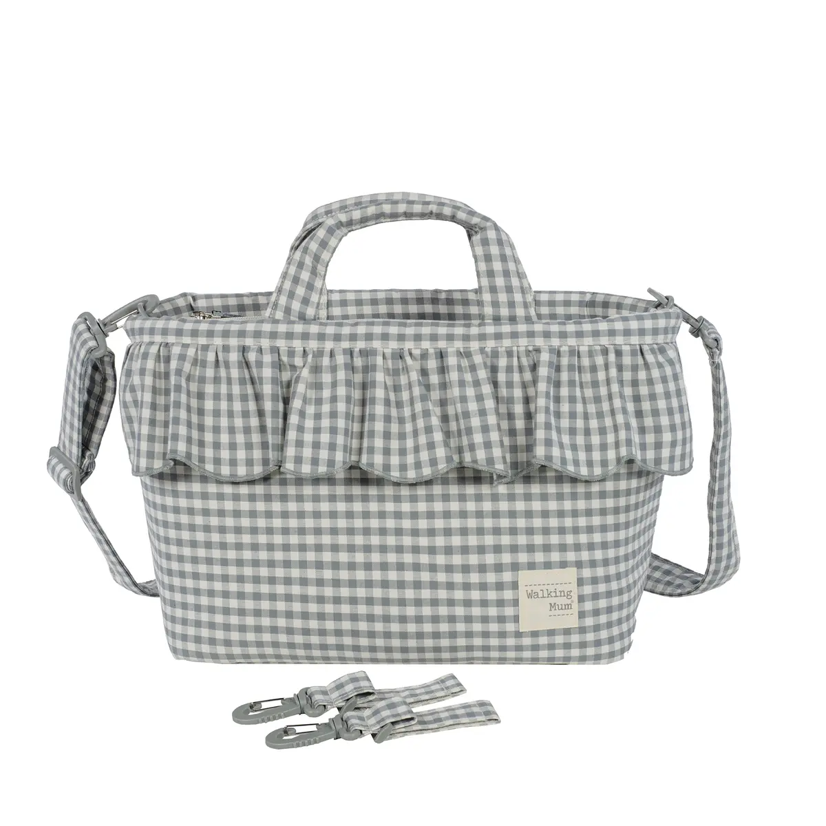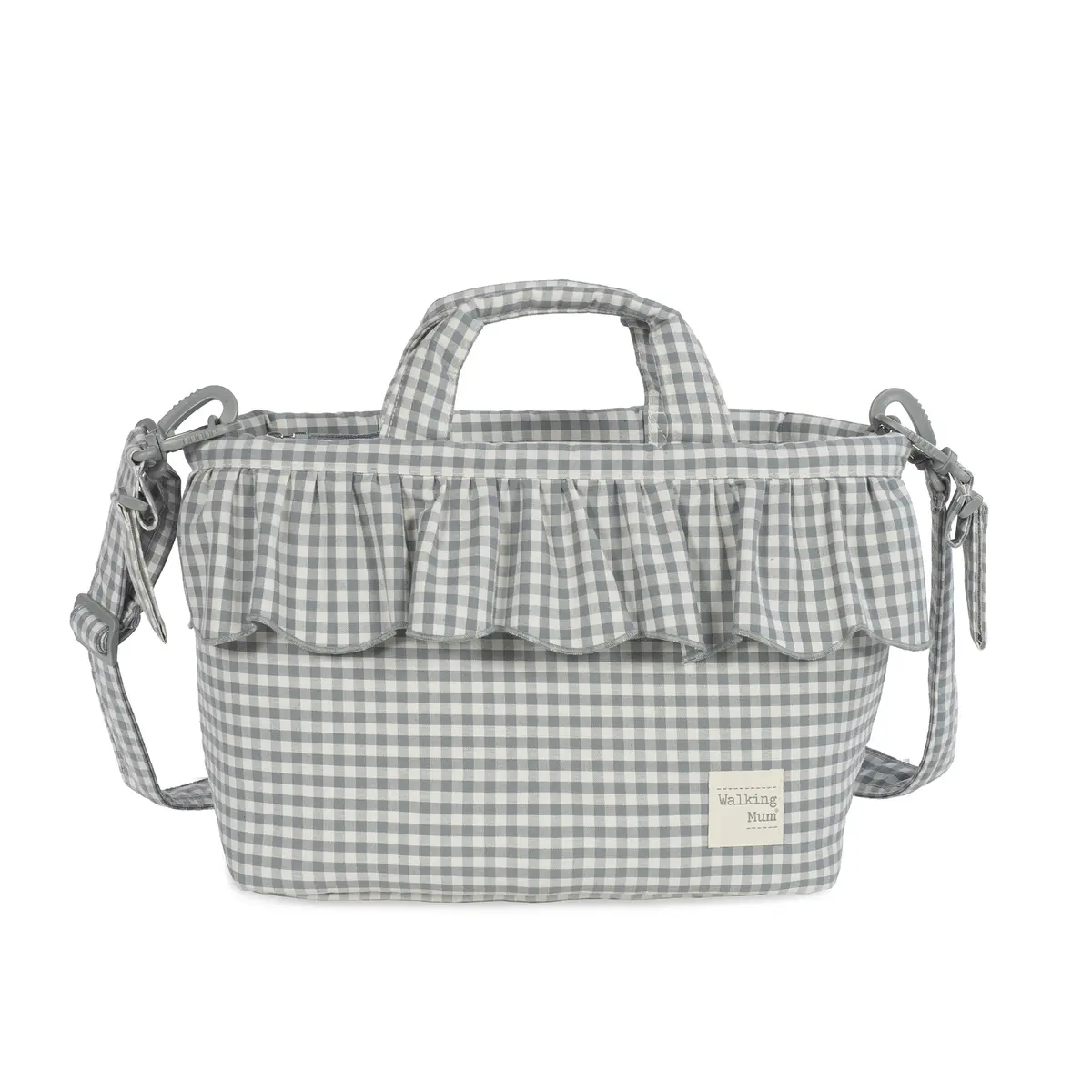 Bolso cambiador Praliné Vichy Matcha para silla de paseo que incluye cambiador para bebe. Bolsa canastilla muy ligera, resistente y de gran capacidad para llevar todo lo necesario para el paseo del bebe. Tiene multiples bolsillos para poder tener todo ordenado. En el interior incopora un bolsillo plastificado para la ropa húmeda, un bolsillo térmico para biberones y dos bolsillos para lo que necesites tener más a mano. La bolsa tiene un sistema universal de fijación, con 2 asas cortas ajustables que facilita la colocación en cualquier modelo de silla de paseo. También incorpora una asa larga para poder colgarla en el hombro y asas cortas para cogerla con la mano. Gran calidad y mucho estilo. Fabricada con un tratamiento water resistant, de fácil limpieza a mano o a máquina a 30 °C. Walking Mum protege a tu bebé utilizando los mejores tejidos, libres de colorantes azoicos y sustancias nocivas para la salud. Nuestra colección Walking Mum está diseñada con un particular sello de estilo urbano y moderno que no pasa desapercibido, para vestir diferente los paseos con tu bebé. Las bolsas de maternidad de esta línea son más sport y prácticas, especialmente pensadas en mamás y papás modernos que aprecian los diseños más actuales y en tendencia sin dejar de lado la calidad y la funcionalidad de los accesorios que complementan y hacen más cómodos todos los paseos con sus bebés. Especificaciones: Materiales: 65% algodón/35% poliéster con tratamiento water resistant. Medidas: 44x29x12 cm.