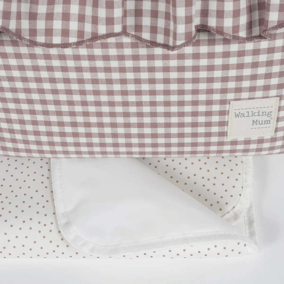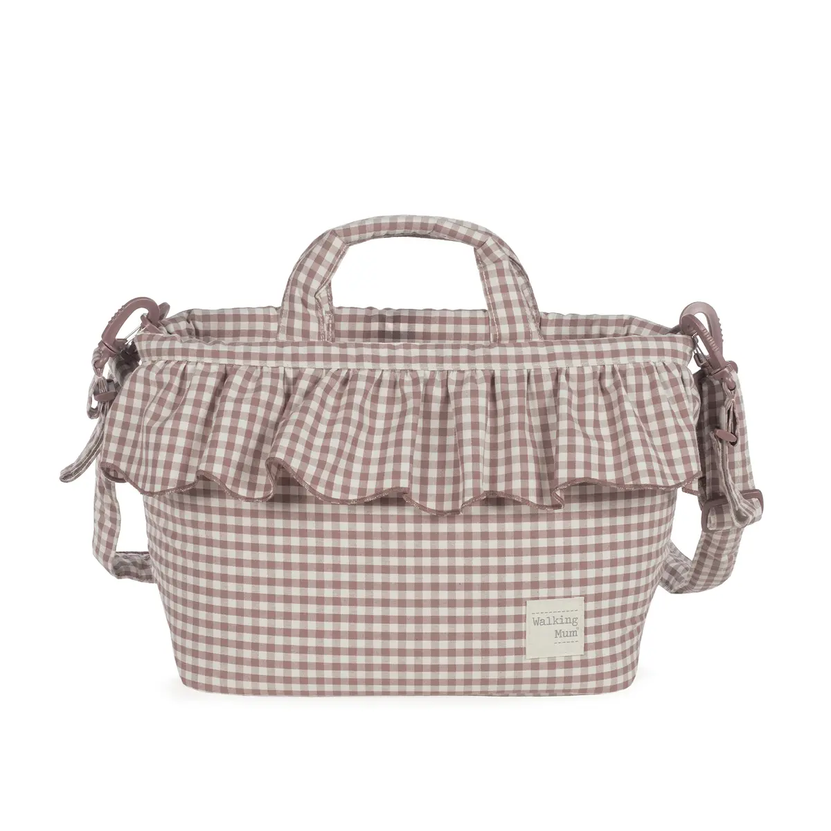 Bolso cambiador Praliné Vichy Moka para silla de paseo que incluye cambiador para bebe. Bolsa canastilla muy ligera, resistente y de gran capacidad para llevar todo lo necesario para el paseo del bebe. Tiene multiples bolsillos para poder tener todo ordenado. En el interior incopora un bolsillo plastificado para la ropa húmeda, un bolsillo térmico para biberones y dos bolsillos para lo que necesites tener más a mano. La bolsa tiene un sistema universal de fijación, con 2 asas cortas ajustables que facilita la colocación en cualquier modelo de silla de paseo. También incorpora una asa larga para poder colgarla en el hombro y asas cortas para cogerla con la mano. Gran calidad y mucho estilo. Fabricada con un tratamiento water resistant, de fácil limpieza a mano o a máquina a 30 °C. Walking Mum protege a tu bebé utilizando los mejores tejidos, libres de colorantes azoicos y sustancias nocivas para la salud. Nuestra colección Walking Mum está diseñada con un particular sello de estilo urbano y moderno que no pasa desapercibido, para vestir diferente los paseos con tu bebé. Las bolsas de maternidad de esta línea son más sport y prácticas, especialmente pensadas en mamás y papás modernos que aprecian los diseños más actuales y en tendencia sin dejar de lado la calidad y la funcionalidad de los accesorios que complementan y hacen más cómodos todos los paseos con sus bebés. Especificaciones: Materiales: 65% algodón/35% poliéster con tratamiento water resistant. Medidas: 44x29x12 cm.