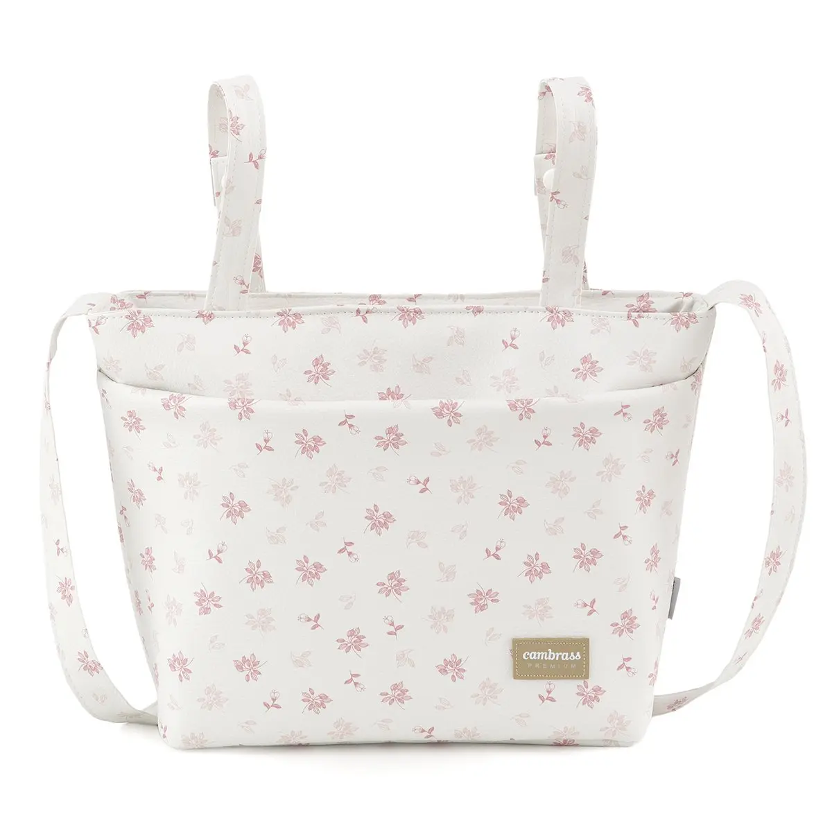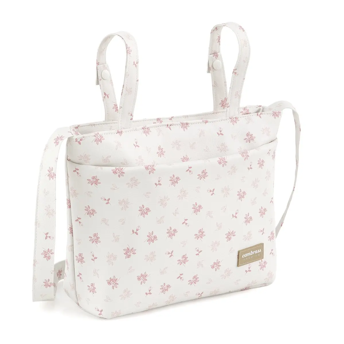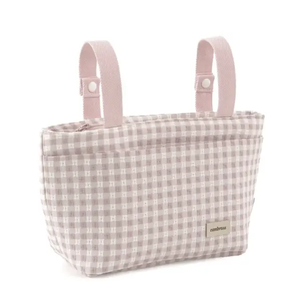 Un bolso organizador con asas cortas para colgar del carrito, con diseño de bolsillos internos y externos, ofrece fácil acceso y orden para los accesorios del bebé durante los paseos. Práctico y accesible.