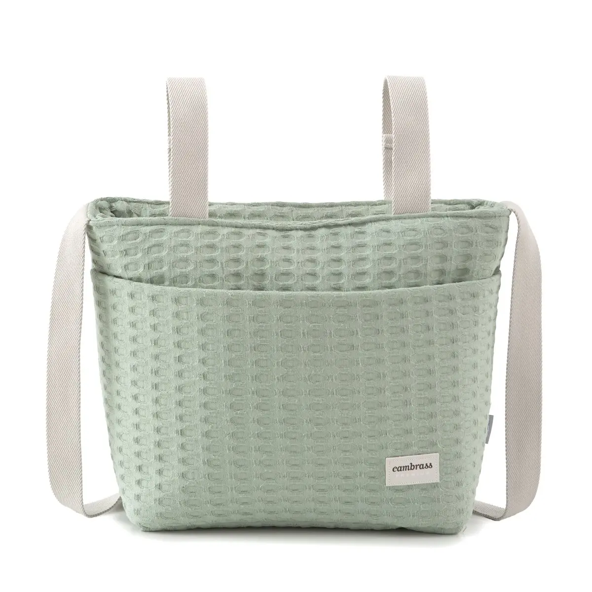 Un bolso organizador con asas cortas para colgar del carrito, con diseño de bolsillos internos y externos, ofrece fácil acceso y orden para los accesorios del bebé durante los paseos. Práctico y accesible.