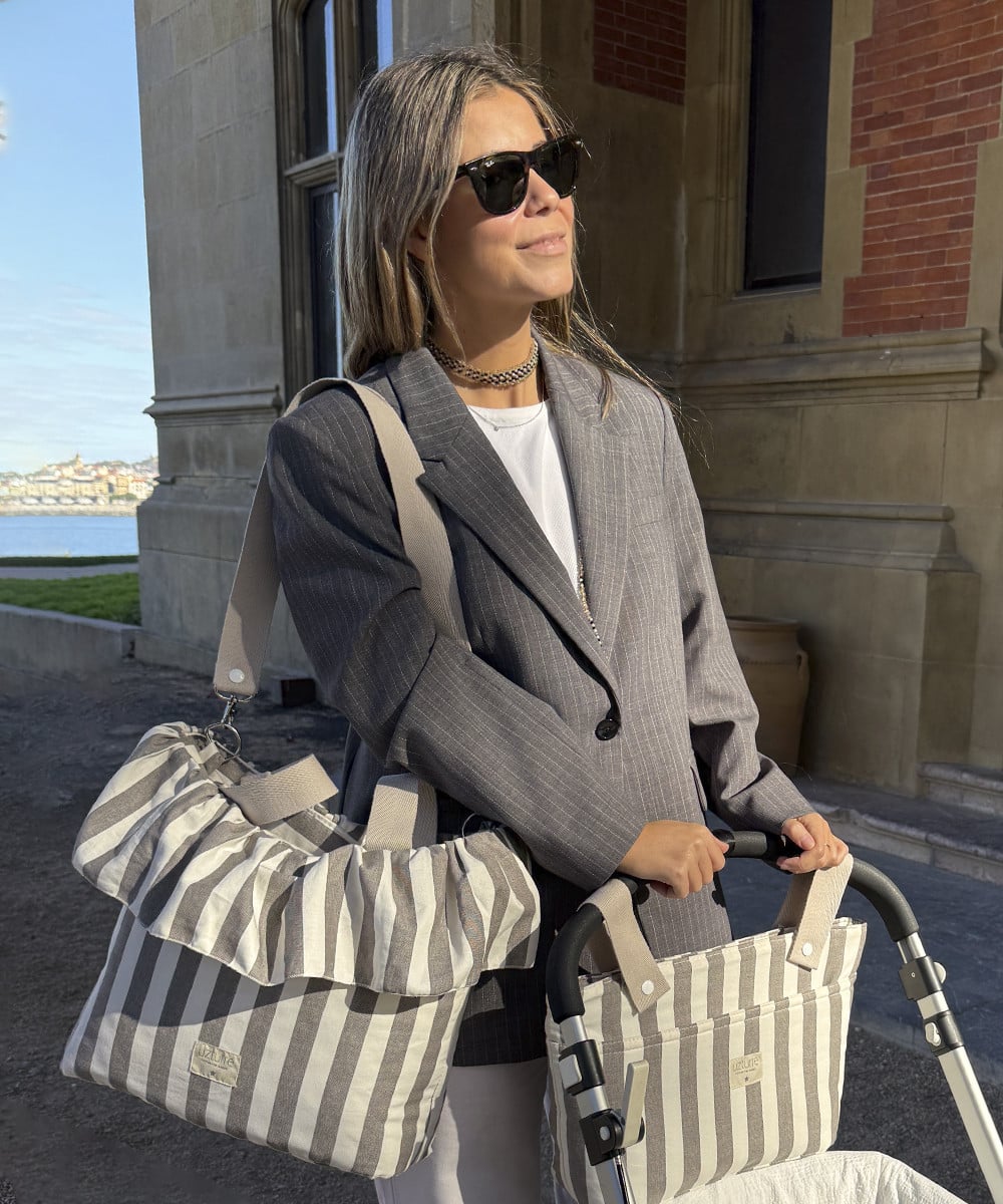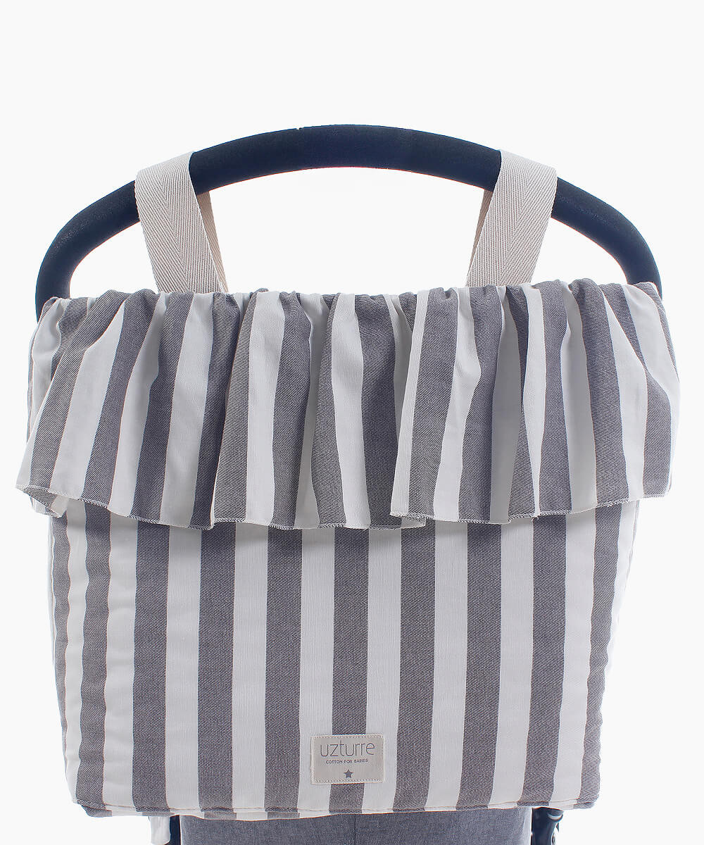 La Talega Volante Raya de Uzturre es un bolso para cochecito que combina elegancia y funcionalidad, ideal para llevar todo lo necesario durante los paseos con el bebé. Su diseño destaca por el detalle de volante y el tejido con estampado de rayas, que aporta un estilo delicado y atemporal, perfecto para completar el look del carrito.