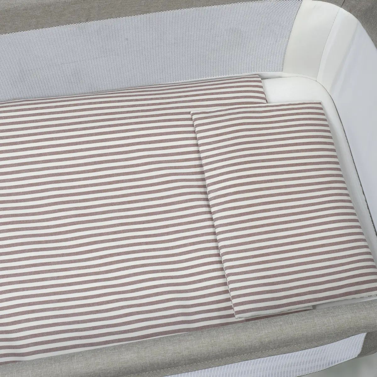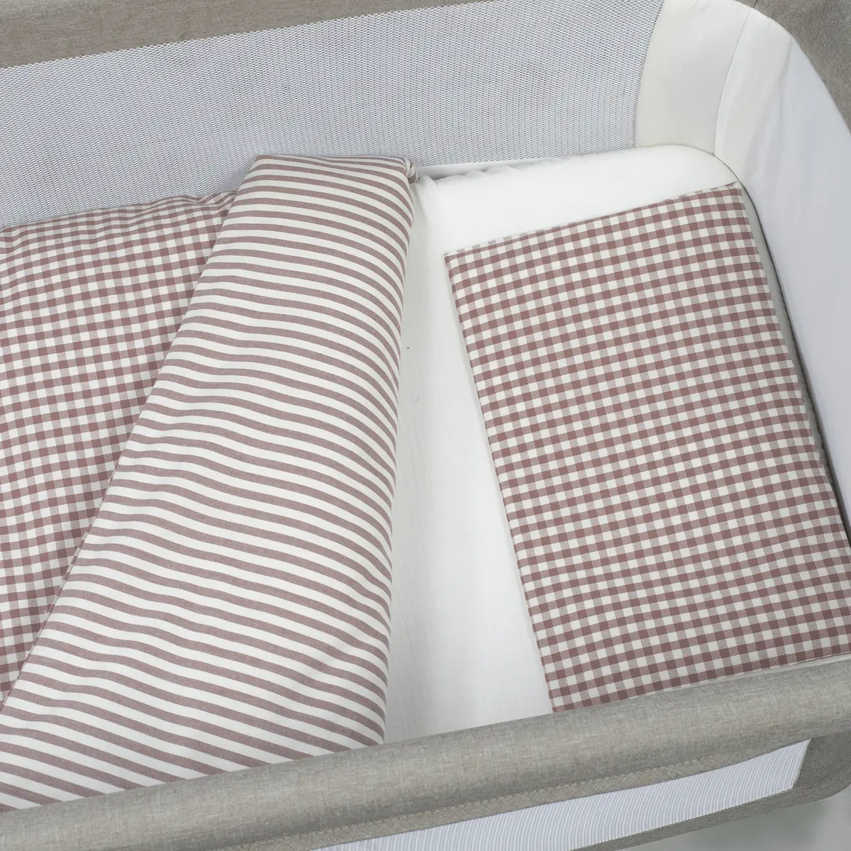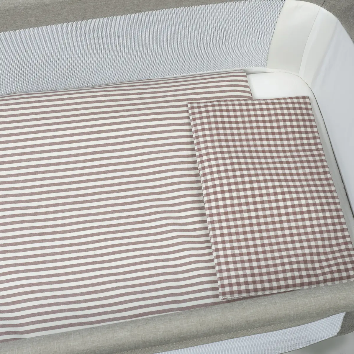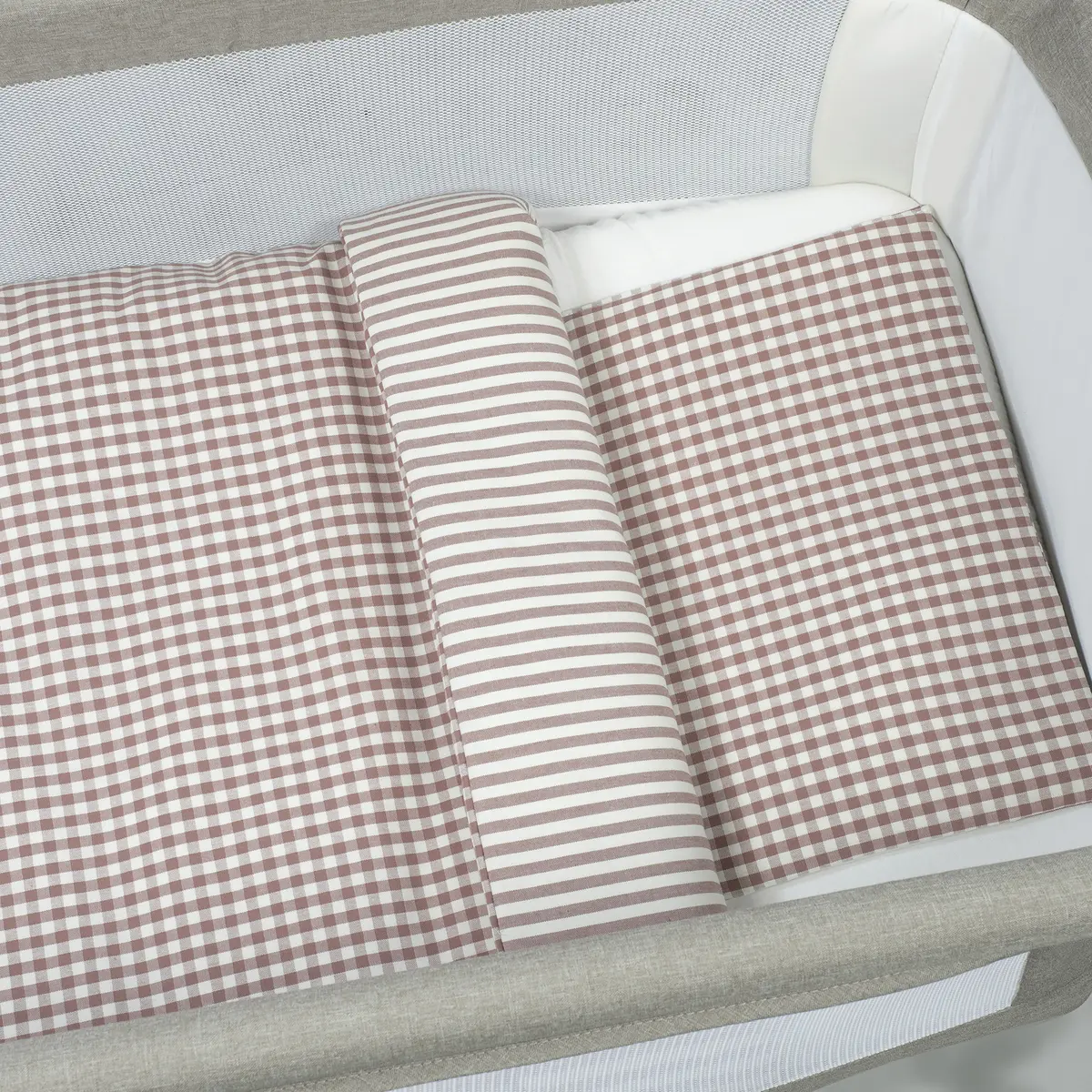 Edredón + bajera + almohada cuna 90×50 cm Praliné Vichy/Rayas Moka TOG 2,5
