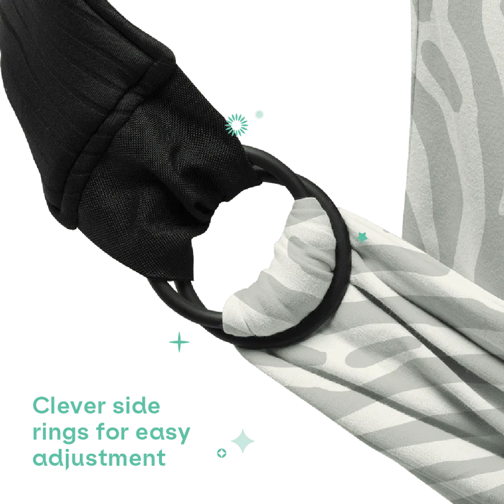 Se trata de un fular portabebés preanudado y ajustable, que se coloca como una camiseta sin necesidad de hacer nudos ni envolturas complicadas. Listo para usar en segundos: te lo pones por la cabeza y listo, gracias a sus anillas laterales para ajustar el tamaño.