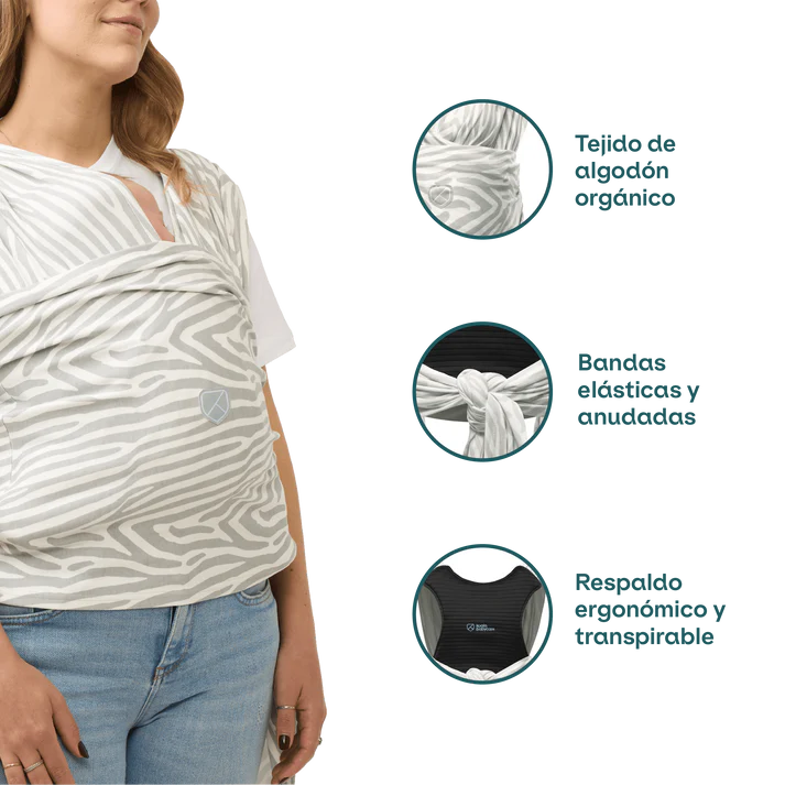 Su respaldo ergonómico y transpirable distribuye el peso de forma uniforme, aliviando la carga en espalda y hombros. Ofrece dos posiciones de porteo: cruz simple y doble hamaca para recién nacidos.