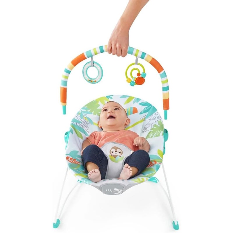 La hamaca vibratoria Rainforest Vibes de Bright Starts ofrece un espacio seguro y cómodo para el bebé. Incluye dos juguetes colgantes, como un tucán de cuentas, que estimulan su desarrollo. Con suaves vibraciones y asiento acolchado, es perfecta para relajarse y jugar, mientras siempre estás cerca de tu bebé