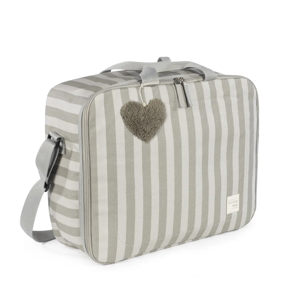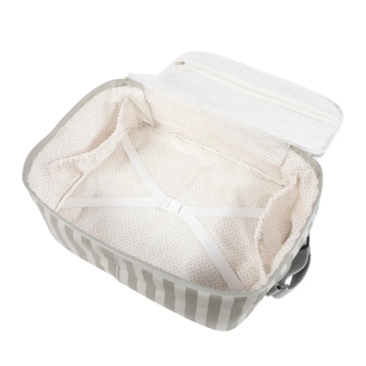 La maleta de bebé Sintra de rayas verde es un bolso especialmente diseñado para el momento más importante del embarazo, que es la llegada de tu bebé, momento en el que hay un montón de cosas que preparar. Por esto necesitas un espacio cómodo para transportar todo lo necesario para ti, el padre y el niño. Esta maleta de bebé es el modelo perfecto para cubrir todo lo que no puede faltar en este día tan especial. Es cómoda, ligera y manejable con dimensiones rectangulares y apertura práctica para tener todas tus necesidades cubiertas. Cuenta con cierre seguro de cremallera en ambas direcciones que facilitan su apertura, incluye una correa larga para llevar colgada en el hombro y asas cortas de mano. Además en el compartimiento interior tiene un forro a juego con gomas para contener la ropa y mantener todo en su lugar. Incluye un charm en forma de estrella donde puedes bordar el nombre de tu bebé para personalizar el bolso. Gran calidad y mucho estilo. Fabricado en un material resistente y de fácil limpieza a mano o a máquina a 30 °C. Walking Mum protege a tu bebé utilizando los mejores tejidos, libres de colorantes azoicos y sustancias nocivas para la salud. Nuestra colección Walking Mum guarda toda la calidad de la marca Pasito a Pasito pero con un particular sello de estilo urbano y moderno que no pasa desapercibido, para vestir diferente los paseos con tu bebé. Las bolsas de maternidad de esta línea son más sport y prácticas, especialmente pensadas en mamás y papás modernos que aprecian los diseños más actuales y en tendencia sin dejar de lado la calidad y la funcionalidad de los accesorios que complementan y hacen más cómodos todos los paseos con sus bebés. Especificaciones: Materiales: 65% algodón /35% poliéster plastificado. Medidas: 49X37X17 cm.