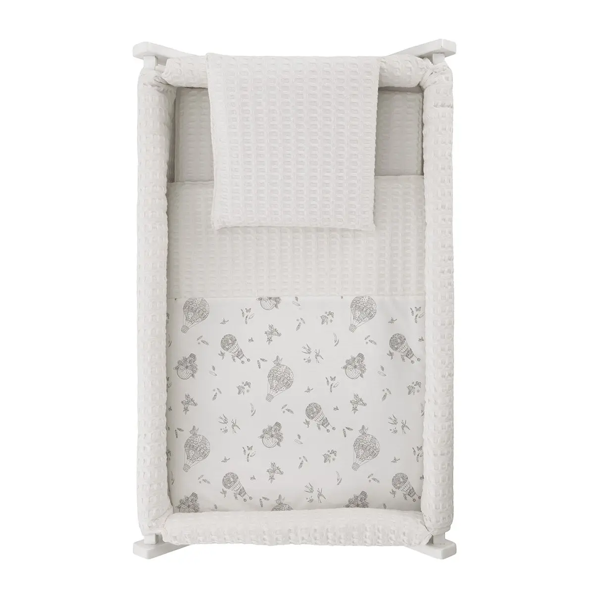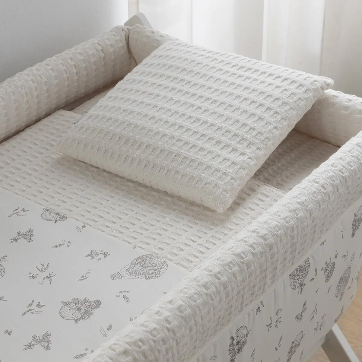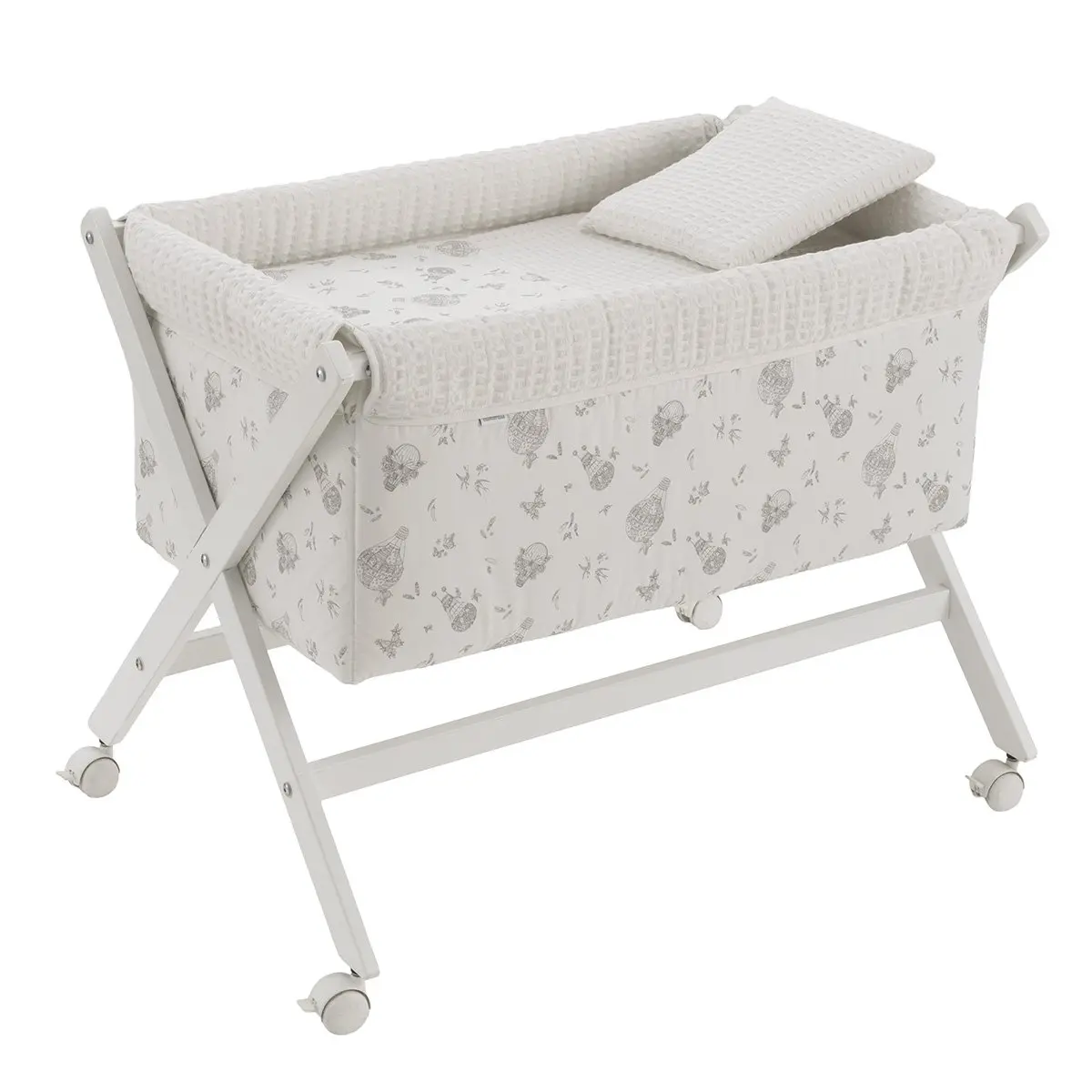 La minicuna con estructura en forma de aspa de Cambrass está fabricada en madera de haya. Permite el descanso del bebé en cualquier estancia de la casa durante los primeros meses de vida gracias a la movilidad que le aportan las ruedas (con freno).Otros aspectos que hacen especialmente funcional esta minicuna, incluye almohada, colchón y somier de madera de 5mm, soporte de madera y su vestidura cosida que incluye la colcha con relleno. Por recomendación de la normativa Europea (EN 1130 UNE-EN 11890:2018) y del real decreto 1801/2003 sobre la seguridad general de los productos, la minicuna no puede ser plegable. Según normativa, debe dejarse de usar la minicuna tan pronto como el niño pueda sentarse por sí solo, levantarse o empujarse con sus manos y rodillas.