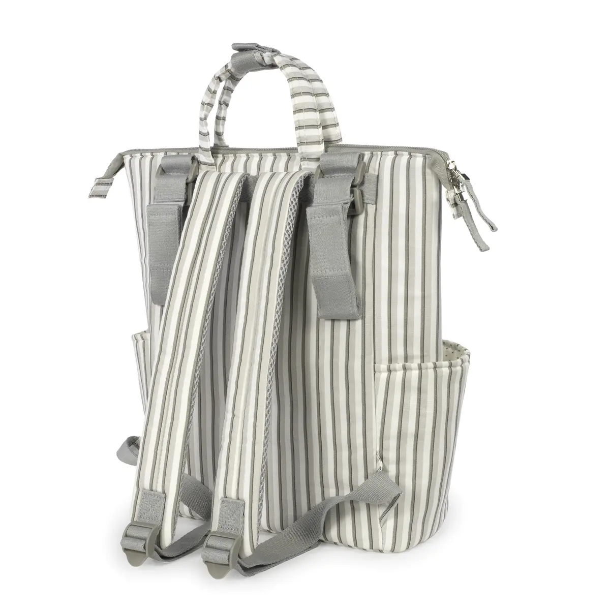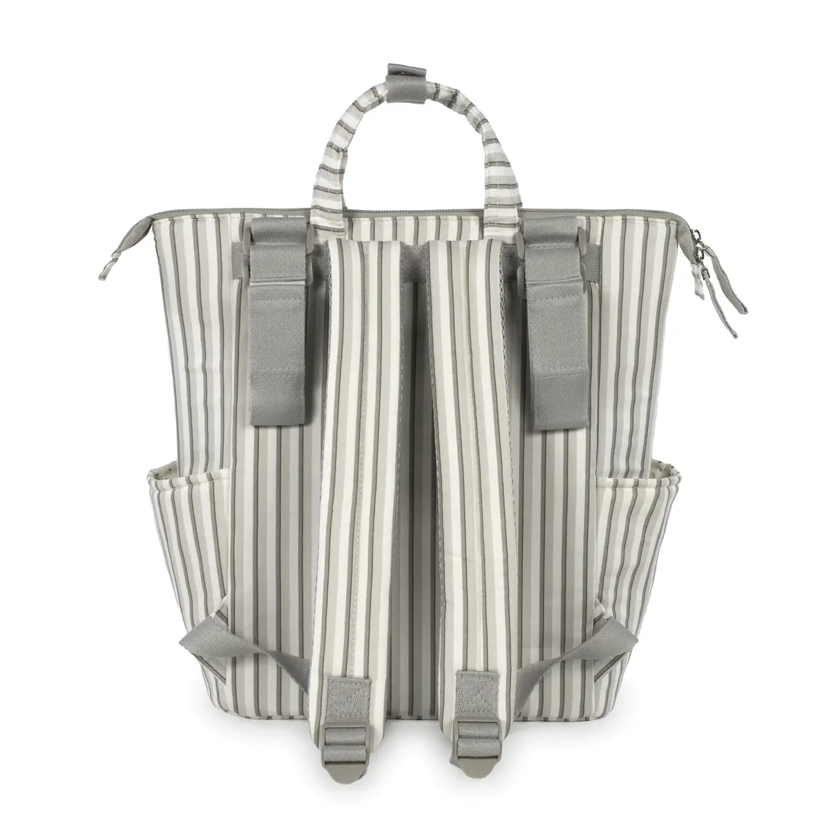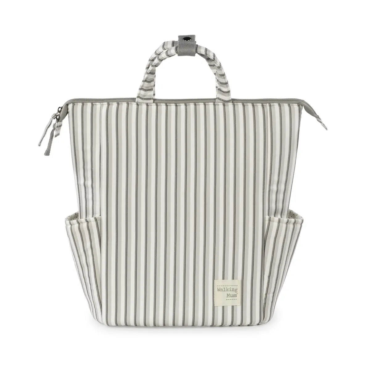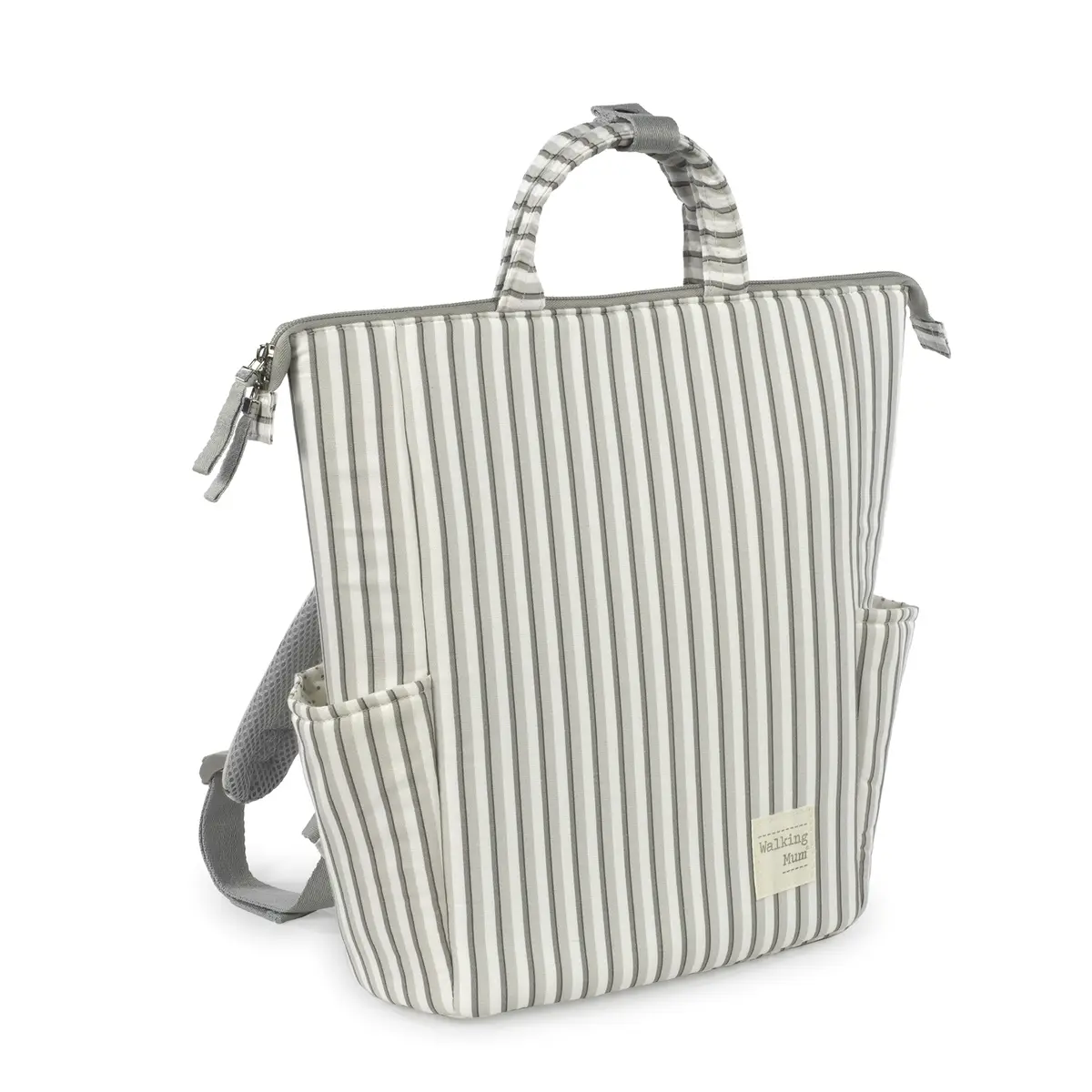 Una bolsa canastilla y mochila al mismo tiempo, ideal para llevar tus cosas y las de tu bebé, con mucho estilo, a todos sus paseos. La mochila Botton con estampado de rayas está fabricada en 100% algodón con un tratamiento waterproof. La mochila para silla de paseo es un modelo multifunción muy ligero, resistente y de gran capacidad para llevar todo lo necesario en el paseo del bebe. Su esquema ofrece múltiples bolsillos exteriores e interiores para poder tener todo ordenado y a mano. Tiene bolsillos para guardar los biberones y mantenerlos seguros, bolsillos para colocar cubiertos, para las toallitas húmedas, también tiene un funda para la botella de agua y otros más. Incluye un cambiador a juego con el bolso de maternidad y un bolsillo plastificado para almacenar la ropa mojada y aislar la humedad del resto de la mochila. El bolso incluye 2 asas cortas ajustables que facilitan la colocación en cualquier modelo de silla de paseo, asas de mano y correas acolchadas para colgar en los hombros hacia la espalda, sin generar molestias por el peso. Gran calidad y mucho estilo. Fabricada en 100% algodón con un tratamiento waterproof, de fácil limpieza se puede lavar a mano o máquina. Walking Mum protege a tu bebé utilizando los mejores tejidos, libres de colorantes azoicos y sustancias nocivas para la salud. Nuestra colección Walking Mum guarda toda la calidad de la marca Pasito a Pasito pero con un particular sello de estilo urbano y moderno que no pasa desapercibido, para vestir diferente los paseos con tu bebé. Las bolsas de maternidad de esta línea son más sport y prácticas, especialmente pensadas en mamás y papás modernos que aprecian los diseños más actuales y en tendencia sin dejar de lado la calidad y la funcionalidad de los accesorios que complementan y hacen más cómodos todos los paseos con sus bebés. Especificaciones: Materiales: 100% algodón. Medidas: 36X26X12 cm.