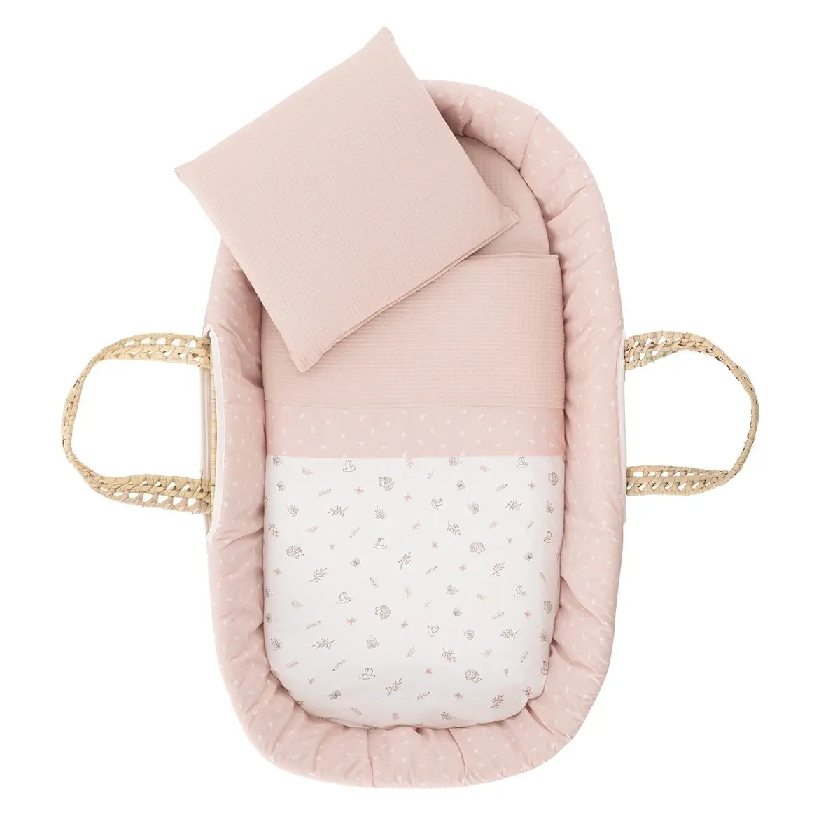 «El moisés de palma acolchado de Cambrass es una opción excepcional para los primeros meses de vida de tu bebé. Su diseño cuidadosamente elaborado ofrece tanto comodidad como funcionalidad para satisfacer las necesidades de tu pequeño durante este período crucial de crecimiento. Fabricado con una base de mimbre, este moisés proporciona una superficie sólida y estable para el descanso de tu bebé. Viene completo con un colchón, una suave colcha, un cómodo cojín y una vestidura coordinable con la decoración de la habitación, añadiendo un toque de estilo y elegancia al entorno.