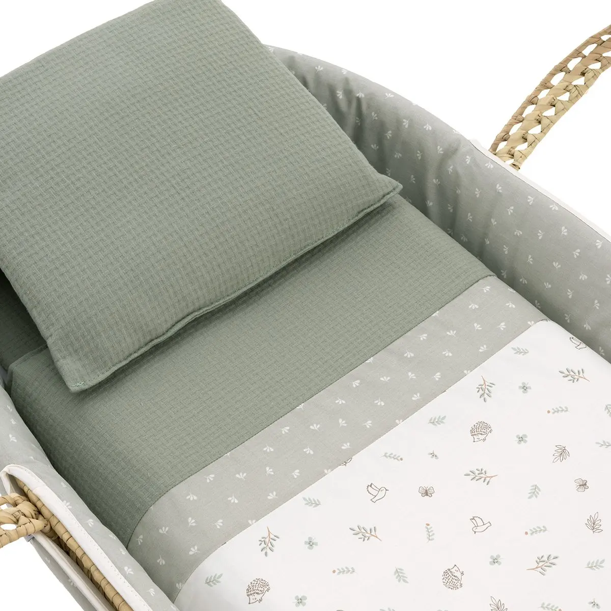 «El moisés de palma acolchado de Cambrass es una opción excepcional para los primeros meses de vida de tu bebé. Su diseño cuidadosamente elaborado ofrece tanto comodidad como funcionalidad para satisfacer las necesidades de tu pequeño durante este período crucial de crecimiento. Fabricado con una base de mimbre, este moisés proporciona una superficie sólida y estable para el descanso de tu bebé. Viene completo con un colchón, una suave colcha, un cómodo cojín y una vestidura coordinable con la decoración de la habitación, añadiendo un toque de estilo y elegancia al entorno.