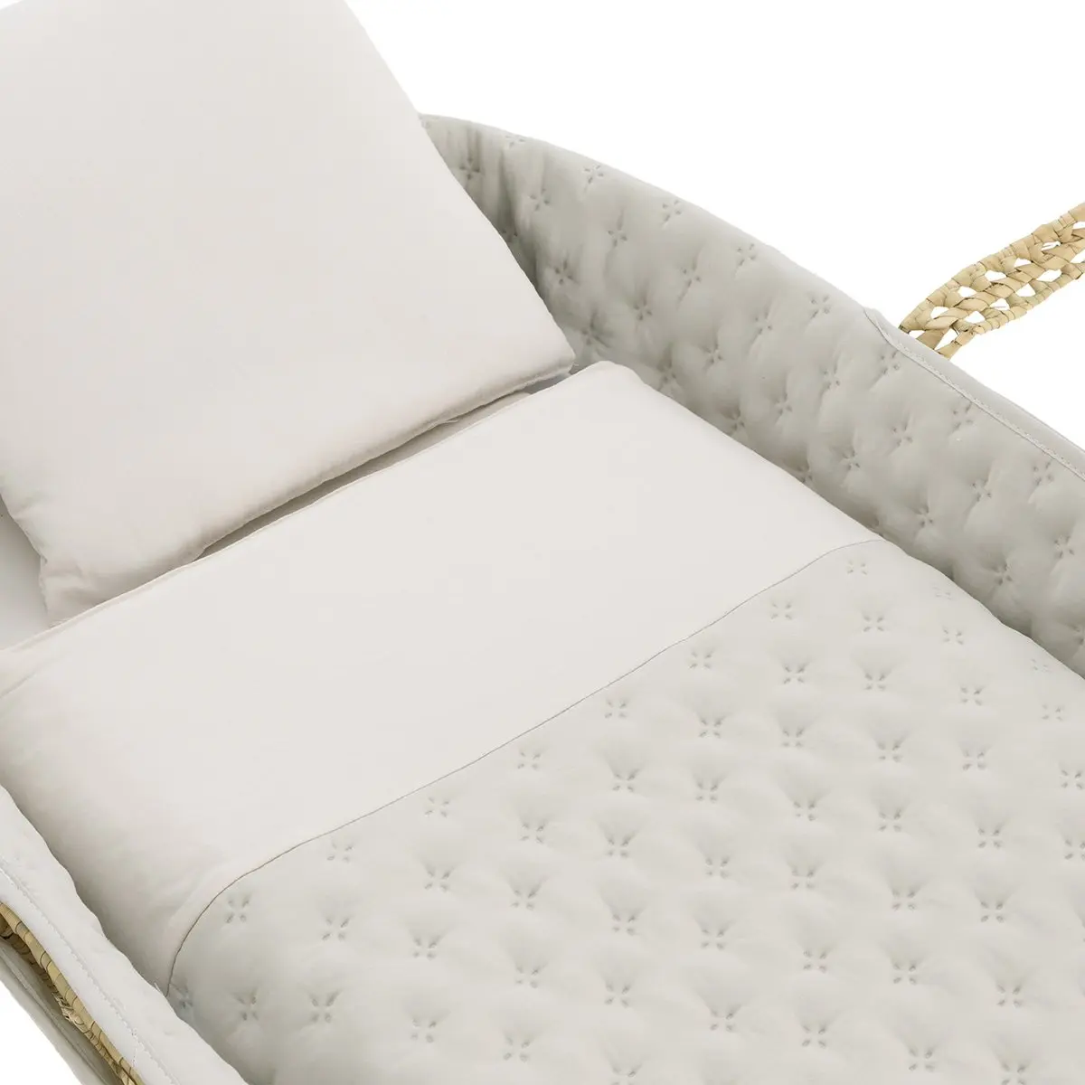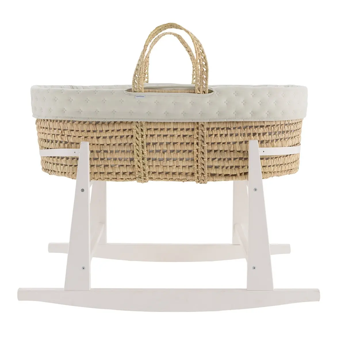 «El moisés de palma acolchado de Cambrass es una opción excepcional para los primeros meses de vida de tu bebé. Su diseño cuidadosamente elaborado ofrece tanto comodidad como funcionalidad para satisfacer las necesidades de tu pequeño durante este período crucial de crecimiento. Fabricado con una base de mimbre, este moisés proporciona una superficie sólida y estable para el descanso de tu bebé. Viene completo con un colchón, una suave colcha, un cómodo cojín y una vestidura coordinable con la decoración de la habitación, añadiendo un toque de estilo y elegancia al entorno.
