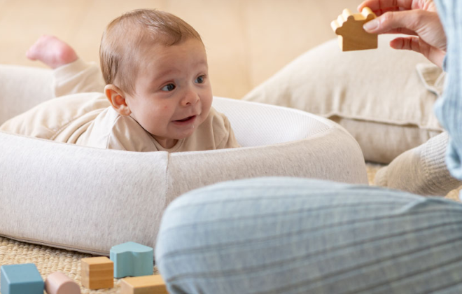 - Diseño Ergonómico: Su forma envolvente favorece la posición correcta del bebé, ayudando a reducir los cólicos y el reflujo, mientras que su base inclinada y acolchada sostiene suavemente la espalda y la cabeza.