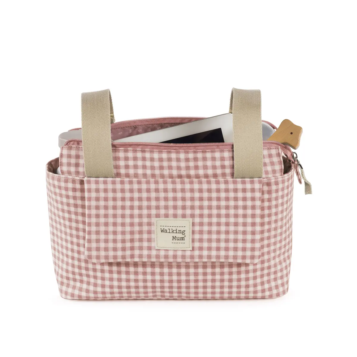 El bolso organizador I love Vichy rosa para silla de paseo es un modelo muy ligero además de ser resistente y espacioso para que puedas llevar todo lo que podrías necesitar durante el paseo de tu bebé. Aparte de la gran capacidad que tiene, está distribuido para facilitarte la organización, con varios bolsillos exteriores e interiores que te ayudarán a colocar todos tus complementos ordenados y así puedes ubicarlos más fácil cuando vayas a usarlos. Su diseño moderno y casual lo hacen perfecto para usar a diario y combinar con tus looks casuales o deportivos. Incorpora asas cortas con las que puedes fijarla a cualquier modelo de silla de paseo. Gran calidad y mucho estilo. Fabricado en un material resistente y de fácil limpieza a mano o a máquina a 30 °C. Walking Mum protege a tu bebé utilizando los mejores tejidos, libres de colorantes azoicos y sustancias nocivas para la salud. Nuestra colección Walking Mum guarda toda la calidad de la marca Pasito a Pasito pero con un particular sello de estilo urbano y moderno que no pasa desapercibido, para vestir diferente los paseos con tu bebé. Las bolsas de maternidad de esta línea son más sport y prácticas, especialmente pensadas en mamás y papás modernos que aprecian los diseños más actuales y en tendencia sin dejar de lado la calidad y la funcionalidad de los accesorios que complementan y hacen más cómodos todos los paseos con sus bebés. Especificaciones: Materiales: 100 % algodón plastificado. Color: Rosa. Medidas: 31 X 17 X 12 cm.
