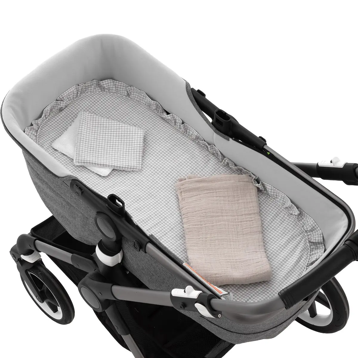 Pack para capazo compuesto por una colcha de capazo, un secababas y una muselina Meyco, pensado para ofrecer confort, protección y practicidad tanto en casa como durante el paseo.