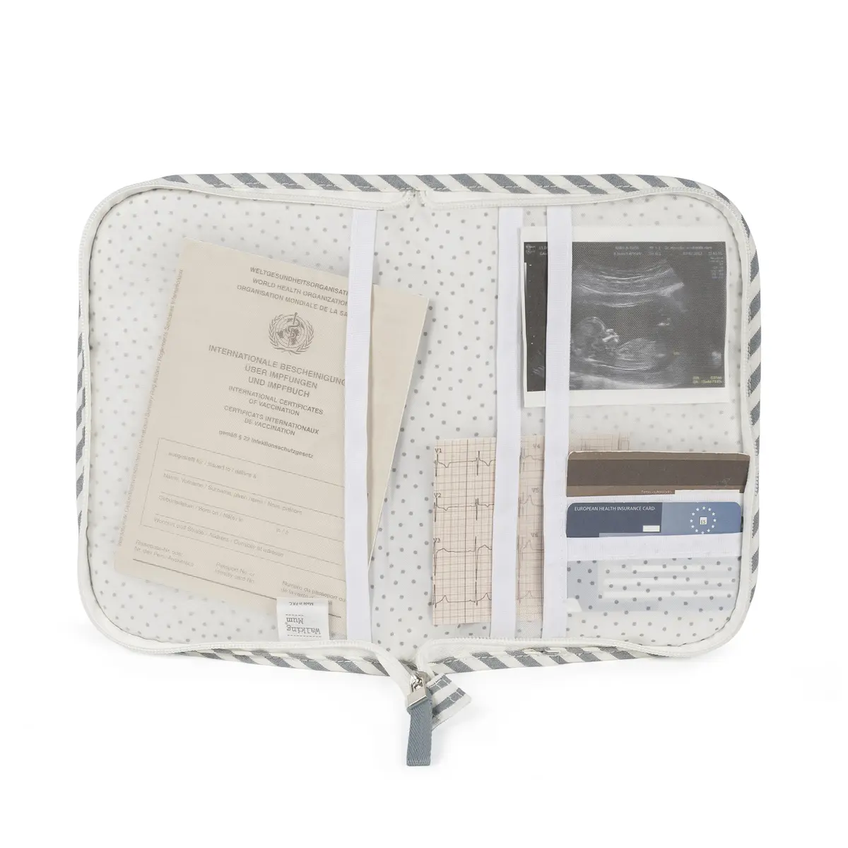 El libro de nacimiento Praliné Rayas Matcha es una funcional carpeta portadocumentos de diseño a juego con la bolsa de maternidad. Un complemento indispensable para llevar contigo a todas partes que te ayudará a tener ordenada toda la documentación y papeles médicos de tu bebé (vacunas, recetas, partida de nacimiento). Esta funda portadocumentos está elaborada en tela tejida, cuenta con múltiples bolsillos distribuidos en ambos lado para organizar mejor todo. También tiene un práctico cierre de cremallera para guardar seguro el libro de nacimiento y todos los documentos de tu bebé. Gran calidad y mucho estilo. Fabricado con un tratamiento water resistant, de fácil limpieza a mano o a máquina a 30 °C. Walking Mum protege a tu bebé utilizando los mejores tejidos, libres de colorantes azoicos y sustancias nocivas para la salud. Nuestra colección Walking Mum está diseñada con un particular sello de estilo urbano y moderno que no pasa desapercibido, para vestir diferente los paseos con tu bebé. Los accesorios de esta línea son más sport y prácticos, especialmente pensadas en mamás y papás modernos que aprecian los diseños más actuales y en tendencia sin dejar de lado la calidad y la funcionalidad de los complementos que hacen más cómodos todos los paseos con sus bebés. Especificaciones: Materiales: 65% agodón/35% poliéster. Medidas: 17x25x1 cm.