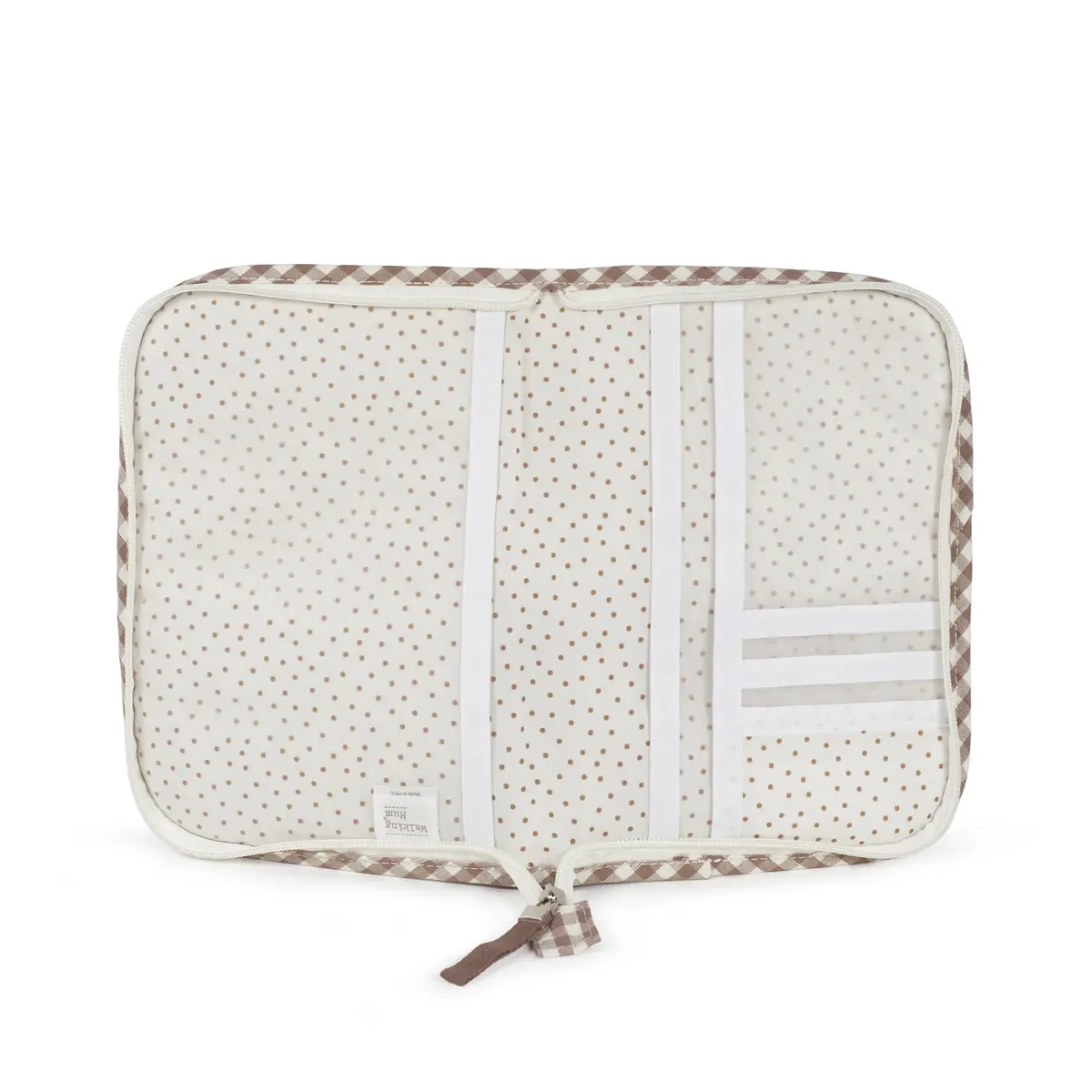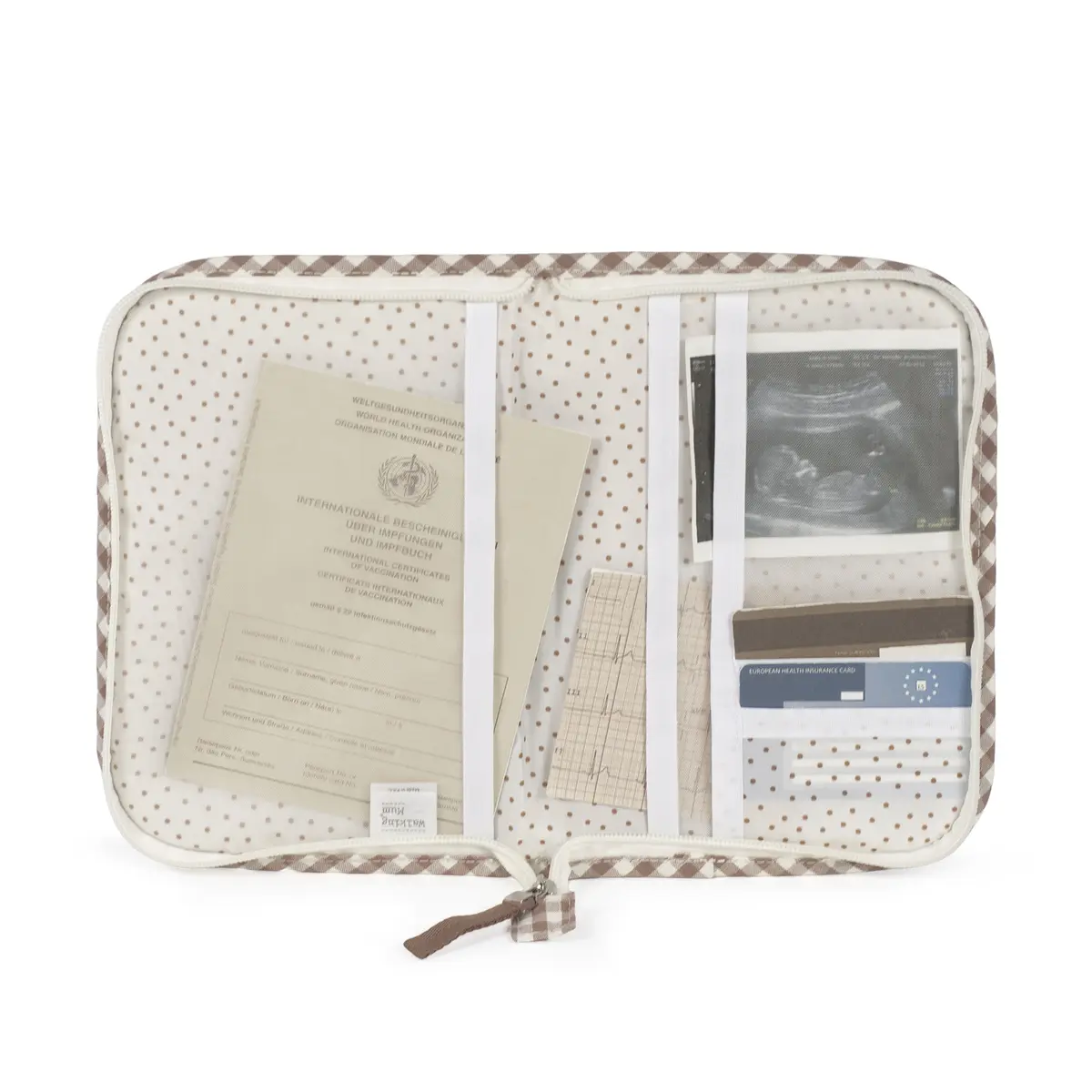 El libro de nacimiento Praliné Vichy Moka es una funcional carpeta portadocumentos de diseño a juego con la bolsa de maternidad. Un complemento indispensable para llevar contigo a todas partes que te ayudará a tener ordenada toda la documentación y papeles médicos de tu bebé (vacunas, recetas, partida de nacimiento). Esta funda portadocumentos está elaborada en tela tejida, cuenta con múltiples bolsillos distribuidos en ambos lado para organizar mejor todo. También tiene un práctico cierre de cremallera para guardar seguro el libro de nacimiento y todos los documentos de tu bebé. Gran calidad y mucho estilo. Fabricado con un tratamiento water resistant, de fácil limpieza a mano o a máquina a 30 °C. Walking Mum protege a tu bebé utilizando los mejores tejidos, libres de colorantes azoicos y sustancias nocivas para la salud. Nuestra colección Walking Mum está diseñada con un particular sello de estilo urbano y moderno que no pasa desapercibido, para vestir diferente los paseos con tu bebé. Los accesorios de esta línea son más sport y prácticos, especialmente pensadas en mamás y papás modernos que aprecian los diseños más actuales y en tendencia sin dejar de lado la calidad y la funcionalidad de los complementos que hacen más cómodos todos los paseos con sus bebés. Especificaciones: Materiales: 65% agodón/35% poliéster. Medidas: 17x25x1 cm.