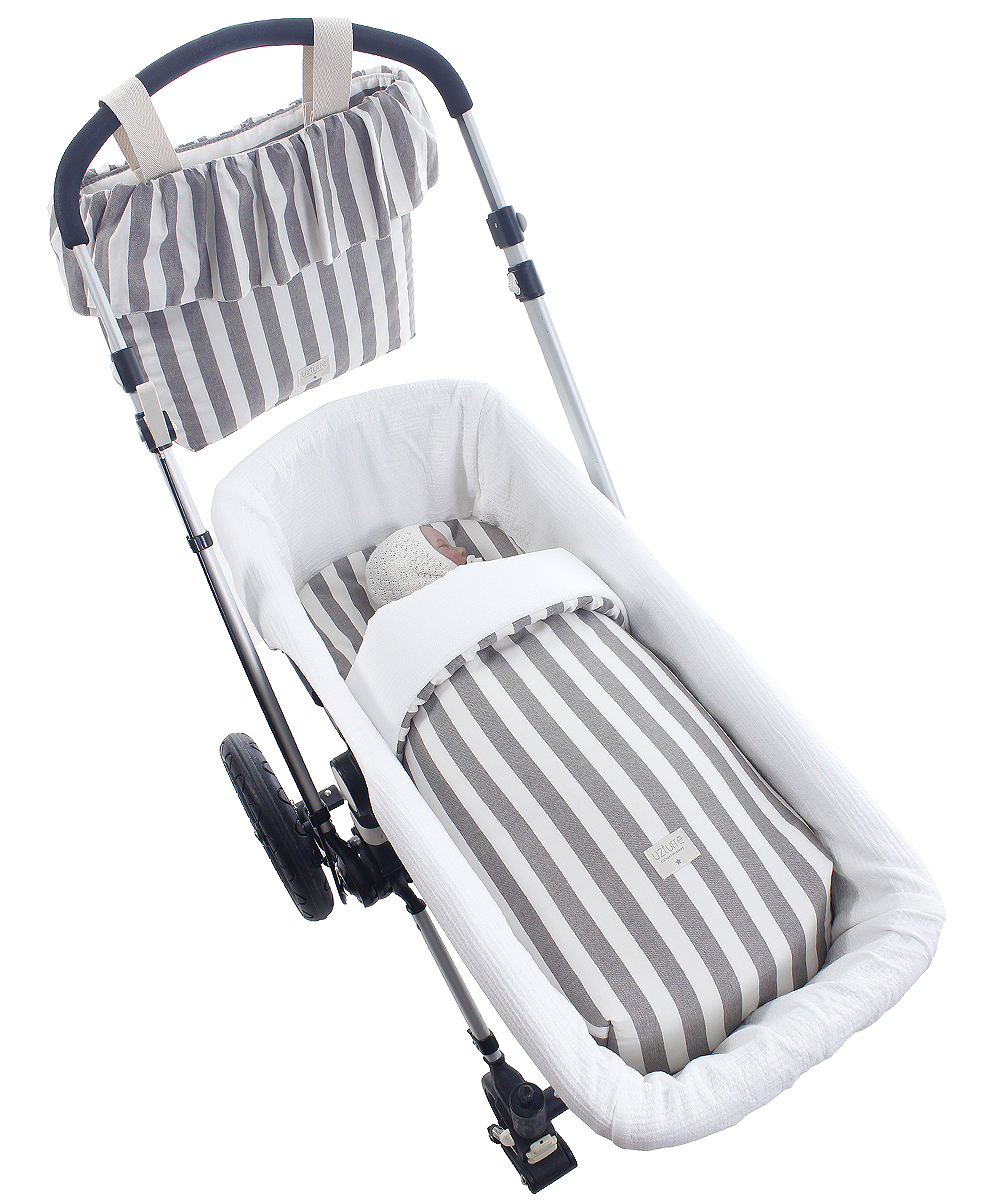 El saco para capazo de la colección Raya de Uzturre es un complemento ideal para mantener al bebé cómodo, protegido y abrigado durante sus primeros paseos. Su diseño elegante de rayas aporta un estilo clásico y atemporal al carrito, combinando perfectamente con otros accesorios de la misma colección.