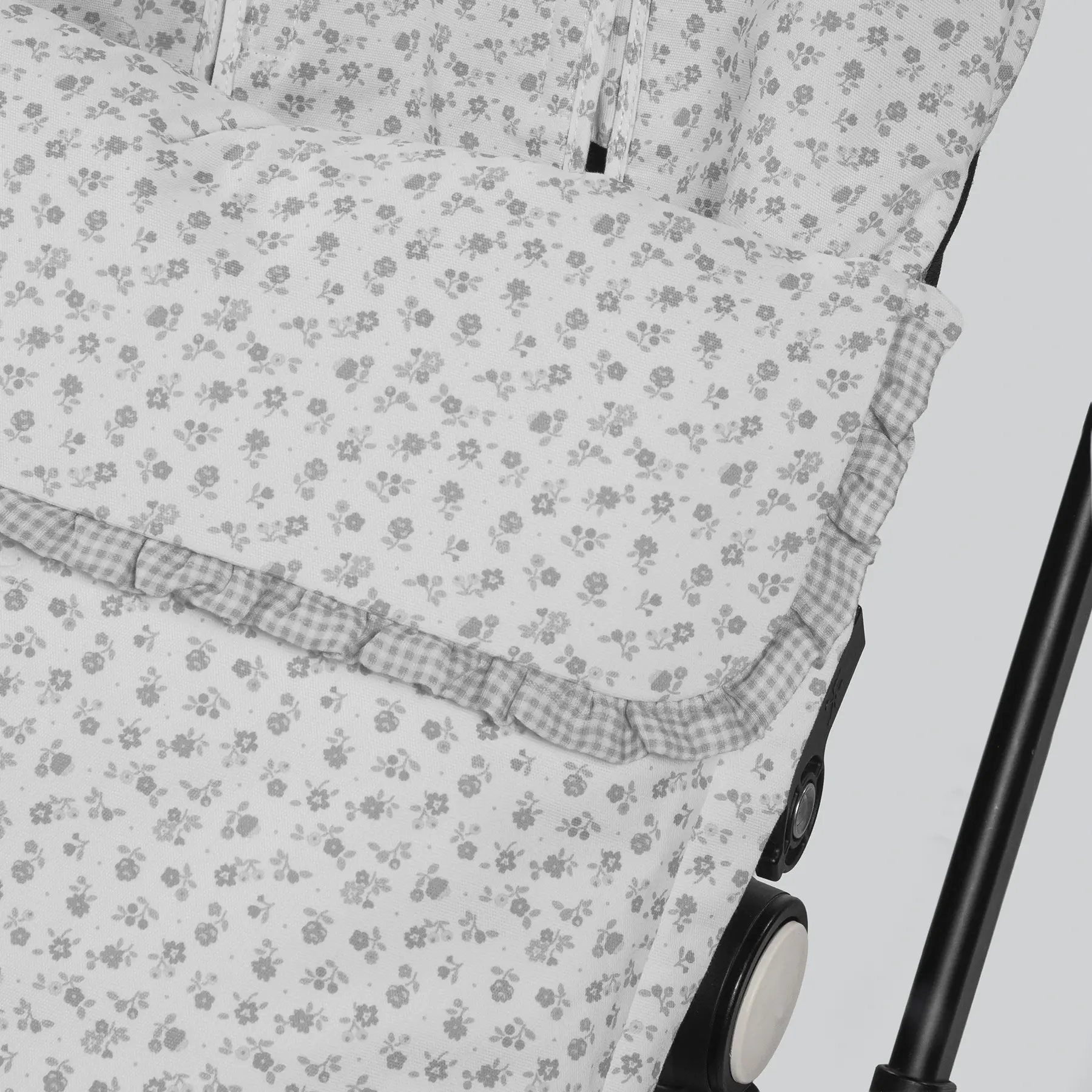 Funda Little Bloom Flor gris de Pasito a pasito en tejido de algodón 100% muy suave ideal para cubrir la silla de paseo provista de saco. Está diseñado en el respaldar con una capa de tejido en material transpirable que aísla la humedad y evita la sudoración excesiva del bebe haciendo el paseo más confortable. Relleno de fibra hueca extraíble. Reposapiés de poliéster para facilitar la limpieza. Dispone de varias aperturas (ojales) y ajustes para adaptarla a la mayoría de la sillitas de paseo, convirtiendo el paseo de tu bebé seguro y confortable. Es un diseño bonito, simple y cómodo que crea un nido para tu bebé manteniéndolo arropado y protegido en días de brisa. El saco se adapta sin problemas a cualquier coche para darle la comodidad que necesita. Acabados de calidad. Todas nuestras fundas están fabricadas conforme a las más exigentes normativas europeas, con materiales de gran calidad, libres de colorantes azoicos, ftalatos y sustancias nocivas para la salud. Tela de fácil limpieza, se recomienda lavar a máquina a 30º. Los productos para bebé de Pasito a Pasito cuentan con un diseño muy diferente a todas las demás. Sus colecciones se caracterizan por el trabajo al detallada, pensadas siempre desde un punto de vista práctico. Utilizan materiales de primera calidad para remarcar la elegancia y la armonía en cada una de sus piezas. Nuestros modelos son exclusivos y de estilo inconfundible, pensados en las madres actuales que gozan de buen gusto y que aprecian los detalles tanto como nosotros. Materiales: 100% algodón. Tamaño universal. TOG 2,5 (Thermal Overall Grade)