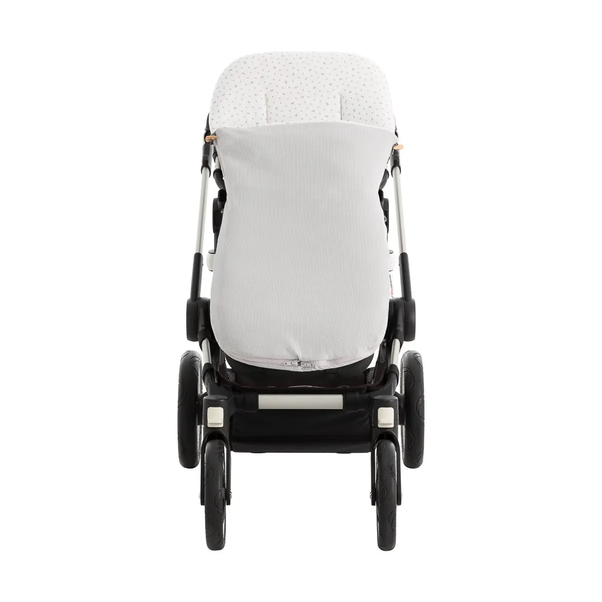 Dispone de platabanda trasera para enfundar perfectamente en la silla y evitar que el saco se caiga o se mueva durante el paseo. En el caso en los que la capota esté fija y no pueda enfundarse directamente en el respaldo, dispone de cintas en la parte trasera para atarlas.