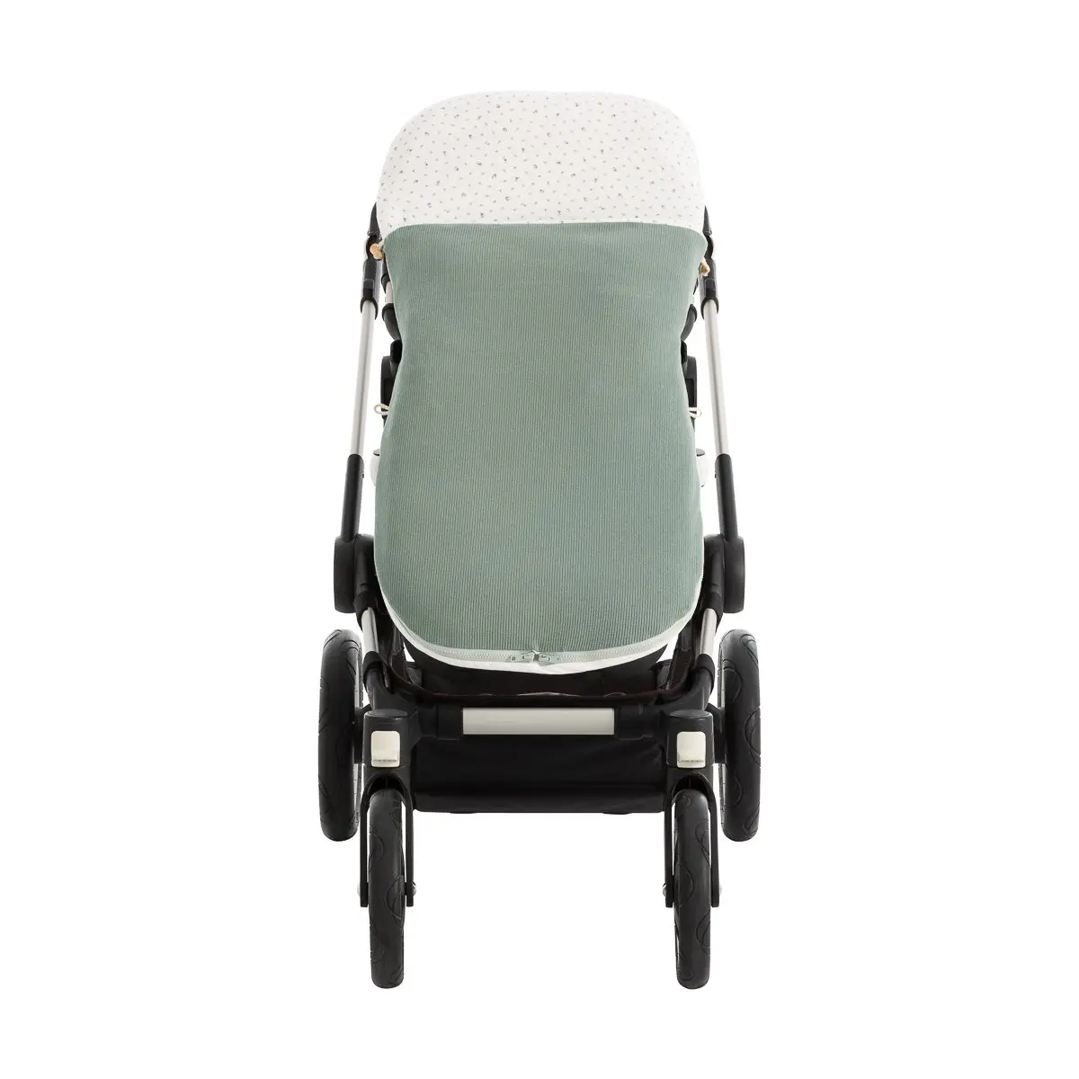 Dispone de platabanda trasera para enfundar perfectamente en la silla y evitar que el saco se caiga o se mueva durante el paseo. En el caso en los que la capota esté fija y no pueda enfundarse directamente en el respaldo, dispone de cintas en la parte trasera para atarlas.
