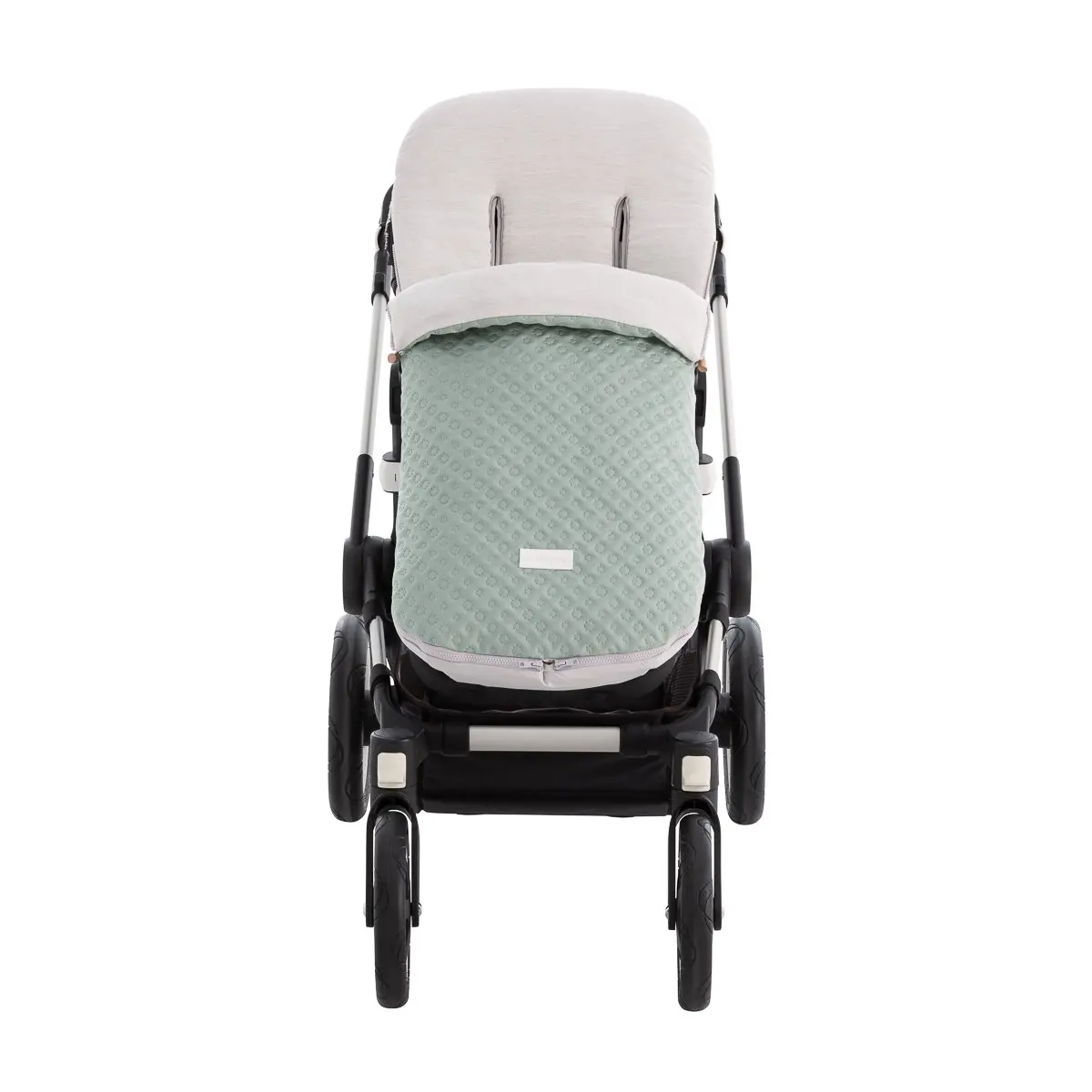 Dispone de platabanda trasera para enfundar perfectamente en la silla y evitar que el saco se caiga o se mueva durante el paseo. En el caso en los que la capota esté fija y no pueda enfundarse directamente en el respaldo, dispone de cintas en la parte trasera para atarlas.