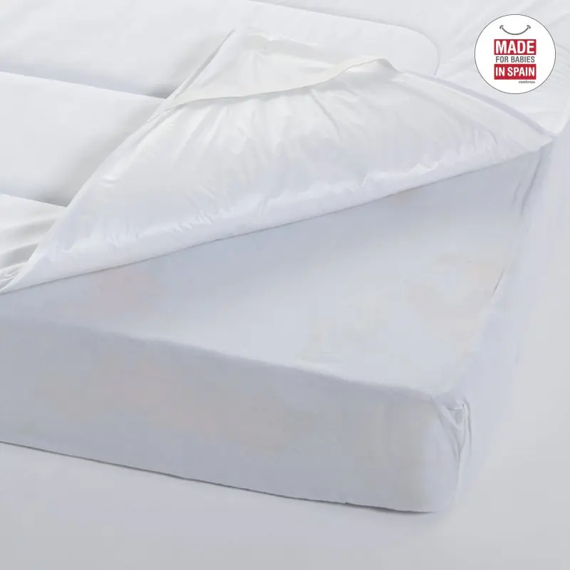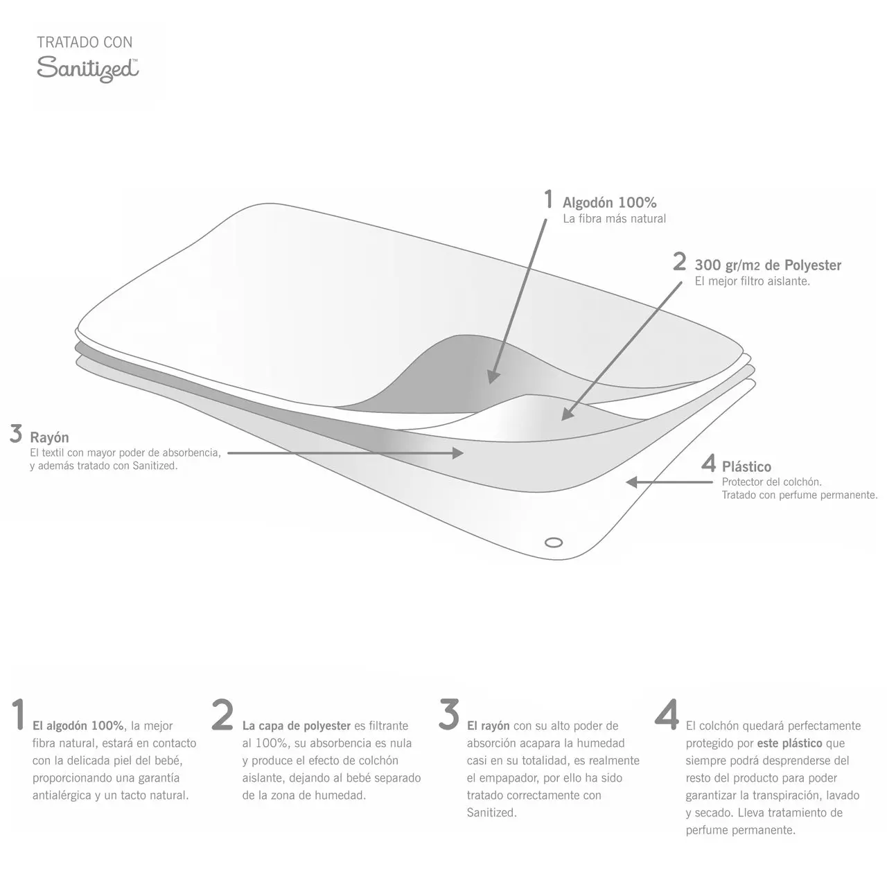 El súper empapador colchón de Cambrass para cuna de 60 cm. sirve para que el bebé duerma seco. El sistema impermeable de 4 capas con el que está fabricado este súper empapador permite que los líquidos queden en las capas inferiores manteniendo al bebé seco en todo momento, además está perfumado lo que le aporta una sensación de confort y frescura adicional. De esta manera la primera capa, fabricada con algodón 100%, garantiza que la piel del bebé esté en contacto con el algodón; La segunda capa es de poliéster y permite que el líquido fluya fácilmente hacia abajo; La tercera capa es de rayón 100%, la fibra textil con mayor capacidad de absorción y finalmente, como media de protección, la cuarta capa tiene un acabado plástico perfumado que aporta una sensación de confort y frescura adicional y una protección total al colchón. Esta última capa de material impermeable y perfumado va ajustada con cuatro puntos de velcro por lo que se puede retirar del conjunto del empapador para su limpieza y aireamiento. El súper empapador se adapta al colchón con cuatro puntos de ajuste de goma elástica. Además el artículo incorpora tratamiento Sanitized que le aporta una protección antimicrobiana duradera que además protege contra la formación de malos olores.